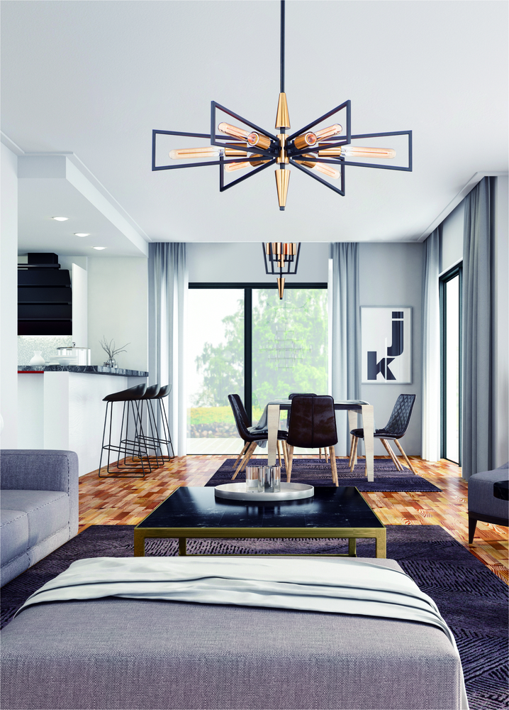 Sharp lines radiate from a pointed pin central body creating geometric angled wings that are sandwiched between matching conical fonts. Finished in a combination Antique Brass and Black, this collection is both contemporary and warm. Complete this look wit