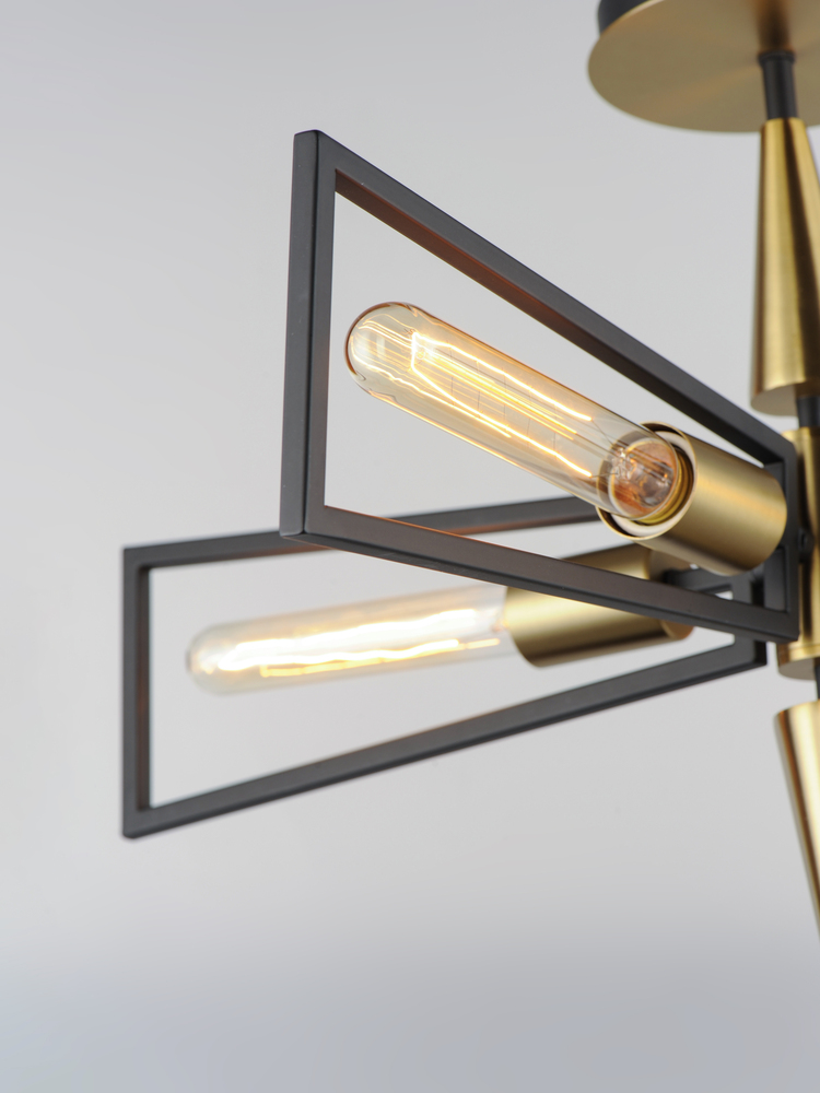 Sharp lines radiate from a pointed pin central body creating geometric angled wings that are sandwiched between matching conical fonts. Finished in a combination Antique Brass and Black, this collection is both contemporary and warm. Complete this look wit