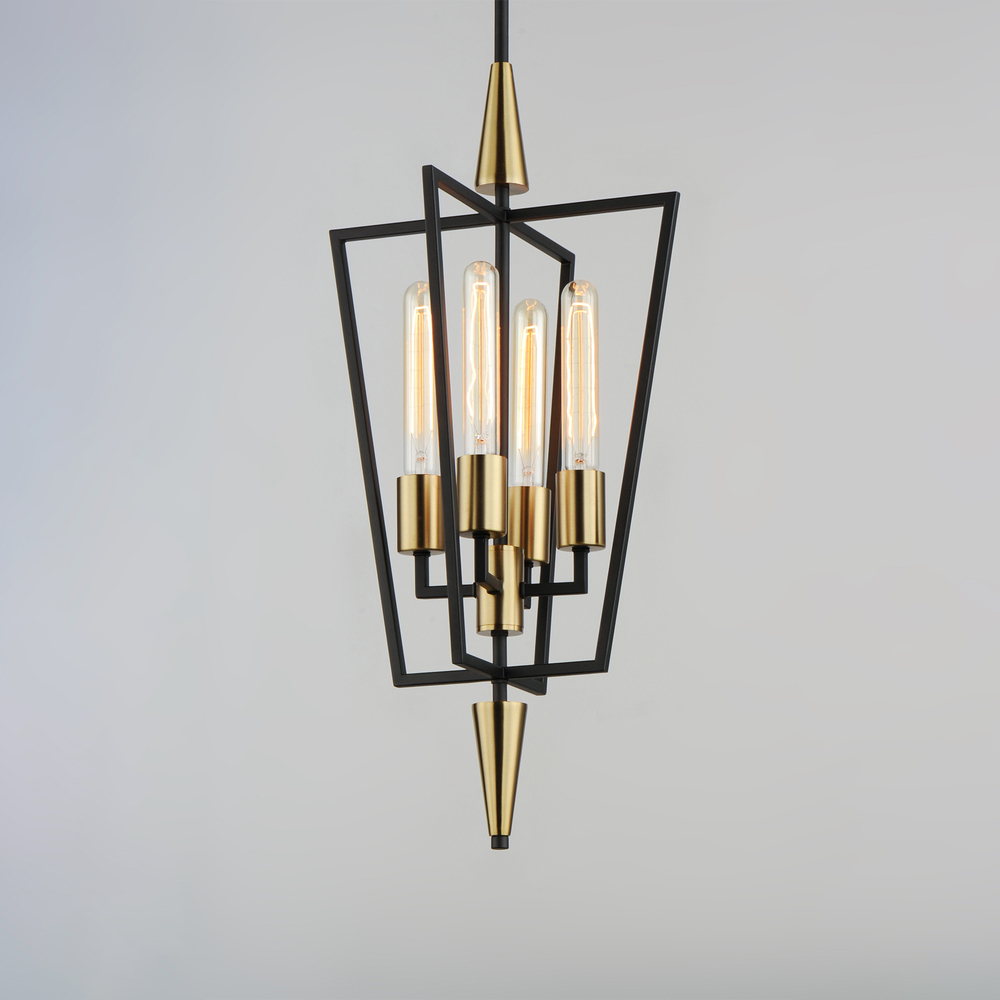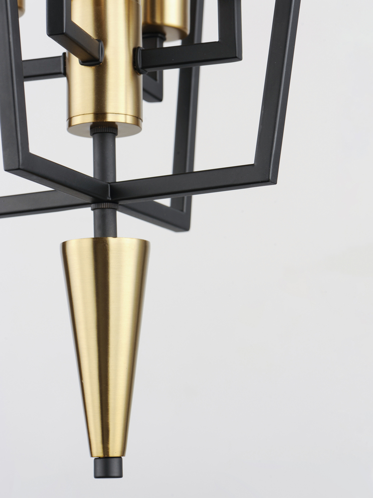 Sharp lines radiate from a pointed pin central body creating geometric angled wings that are sandwiched between matching conical fonts. Finished in a combination Antique Brass and Black, this collection is both contemporary and warm. Complete this look wit