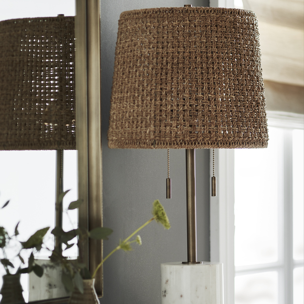 Solid marble base accented with a brass pole body topped with a core rattan and lampakanay rope lamp shade and a cylinder-shaped brass finial.