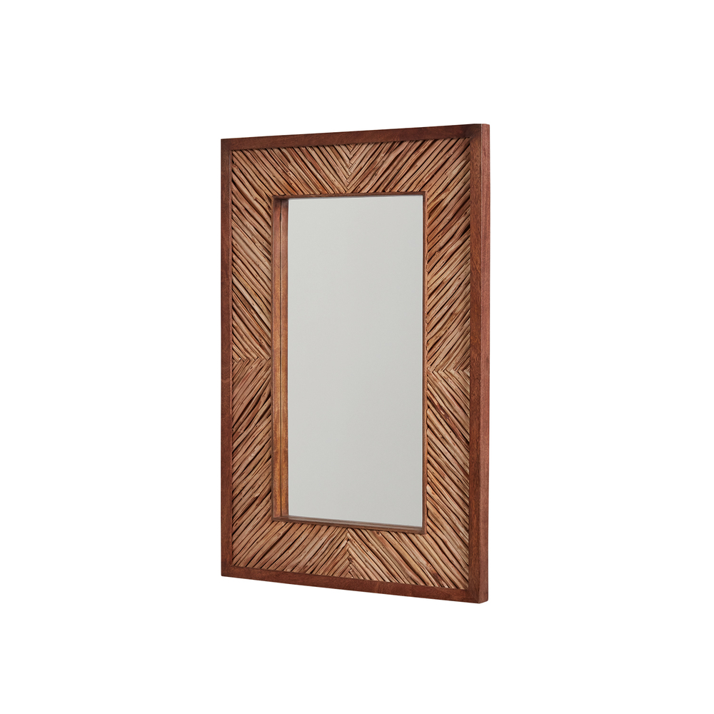 Wood framed mirror with Wood Blend finish. Wood Frame with Hand-Arranged Wood Pieces. Wire Hanger, Horizontal or Vertical Mounting.