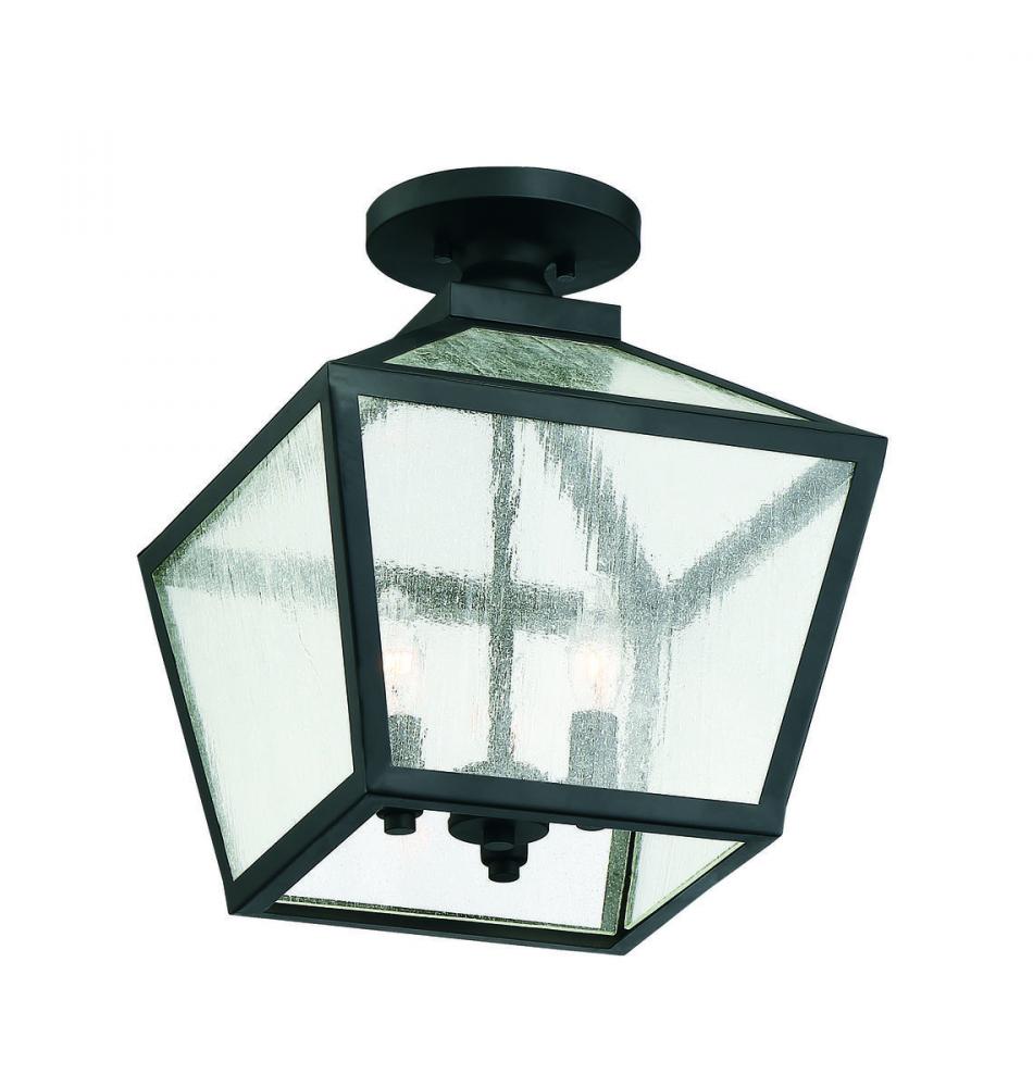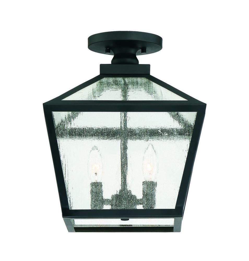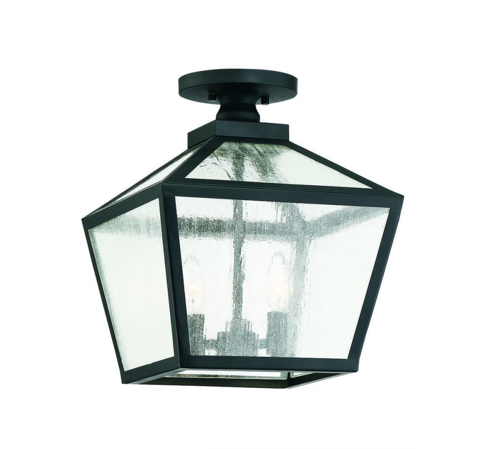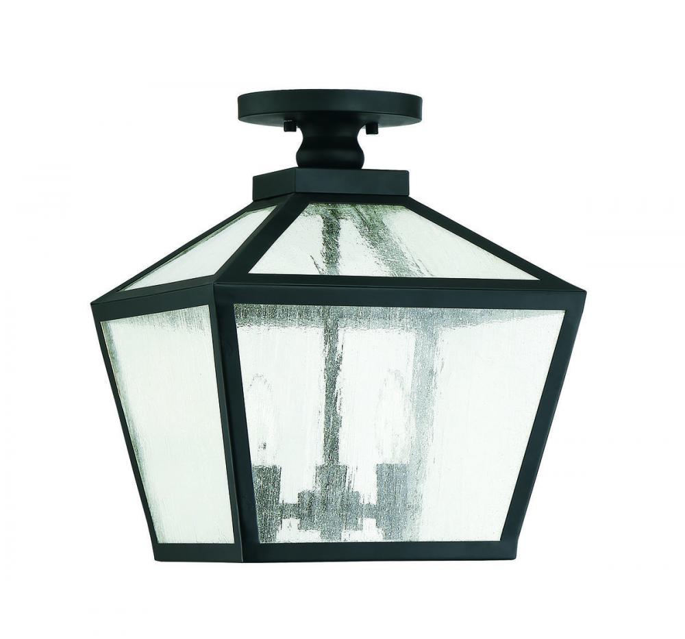 The traditional charm of vintage lanterns blends beautifully with streamlined, contemporary appeal in this Savoy House Woodstock 3-light outdoor ceiling light. Everyone who enters your home will feel welcomed and appreciate its classic style. Finished in matte black with clear seeded glass panes that add wonderful textural interest. The 14" high by 12" wide size makes it perfect to place this light on an outdoor ceiling, such as a porch, entry, covered patio or sunroom. Uses 3 candelabra size bulbs of up to 60 watts each. Damp area rated.