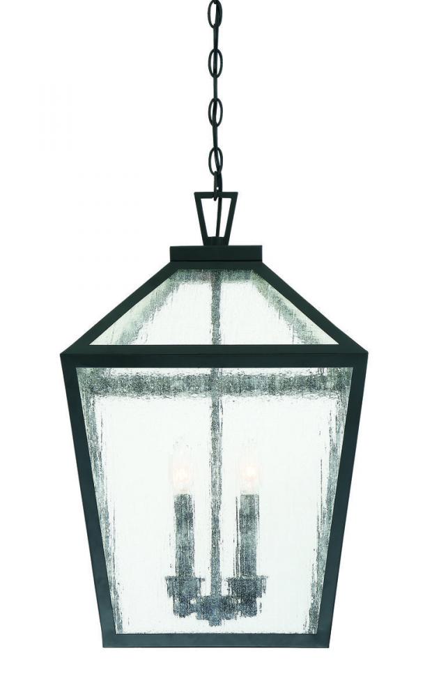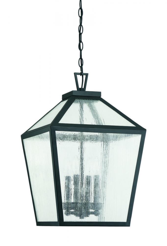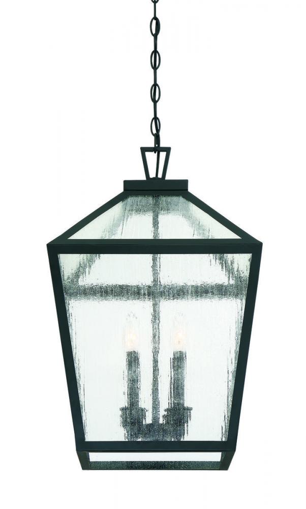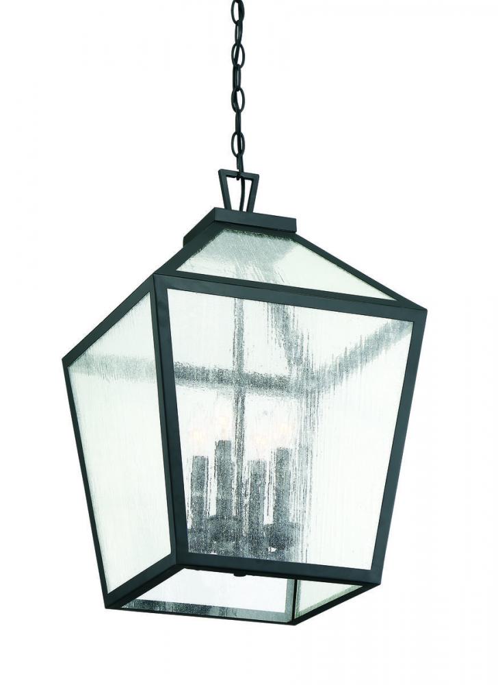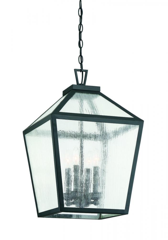The traditional charm of vintage lanterns blends beautifully with streamlined, contemporary appeal in this Savoy House Woodstock 4-light outdoor hanging lantern. Everyone who enters your home will feel welcomed and appreciate its classic style. Finished in matte black with clear seeded glass panes that add wonderful textural interest. The 23.5" high by 15" wide size makes it perfect to hang this lantern from an outdoor ceiling, such as a porch, entry, covered patio or sunroom. Uses 4 candelabra size bulbs of up to 60 watts each. Damp area rated.