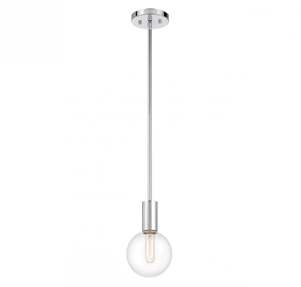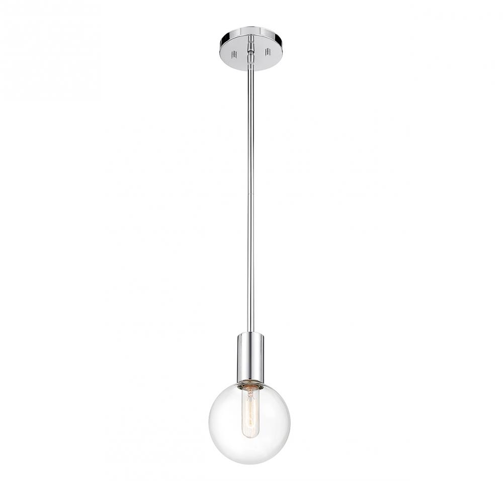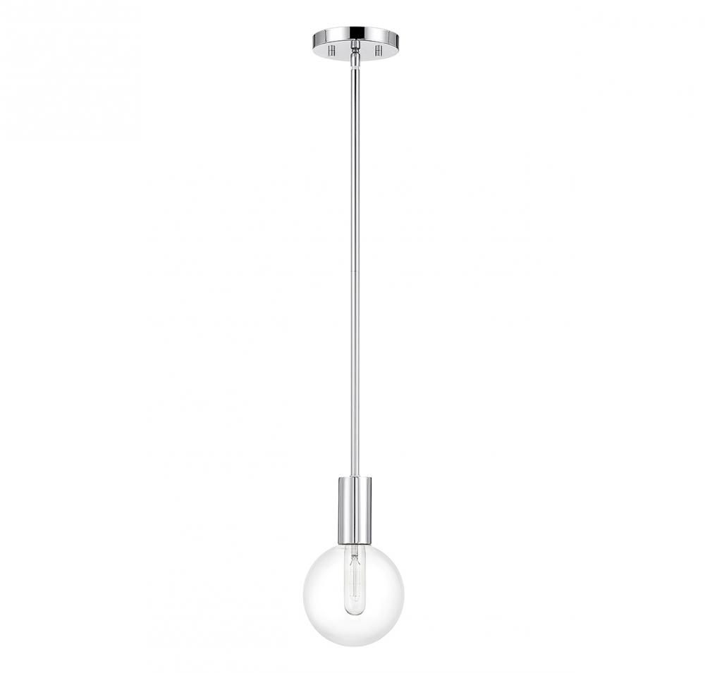 This Savoy House Wright 1-light mini pendant showcases streamlined style that makes it ideal for any space. A round clear glass shade adds an extra dimension and extra protection for the light bulb within. Chrome finish. Wright is 5.75" in width and has an adjustable height ranging from 19.25" to 38.25". Comes with three 9.5" downrods. Uses 1 standard size bulb with a max of 60 watts (bulb not included). We recommend using a tubular shaped bulb.