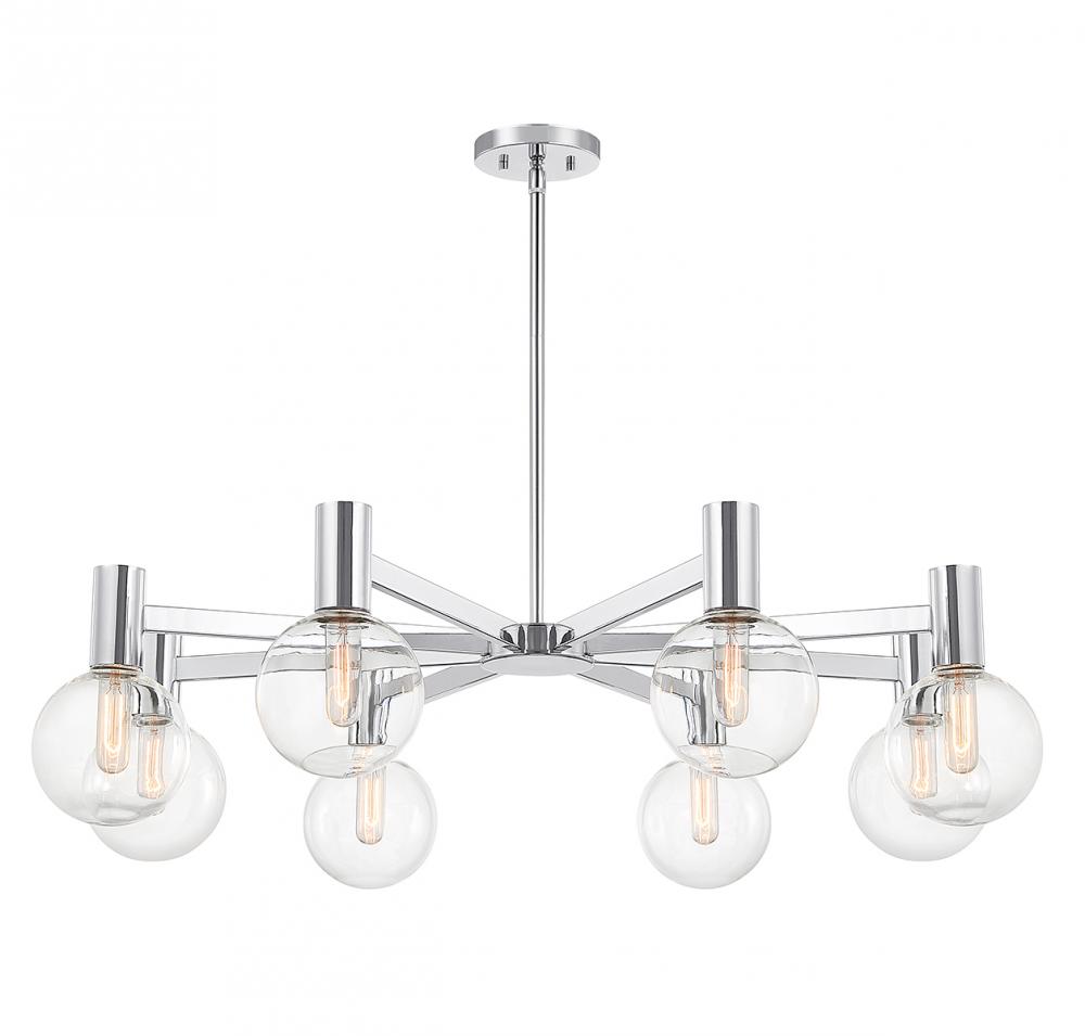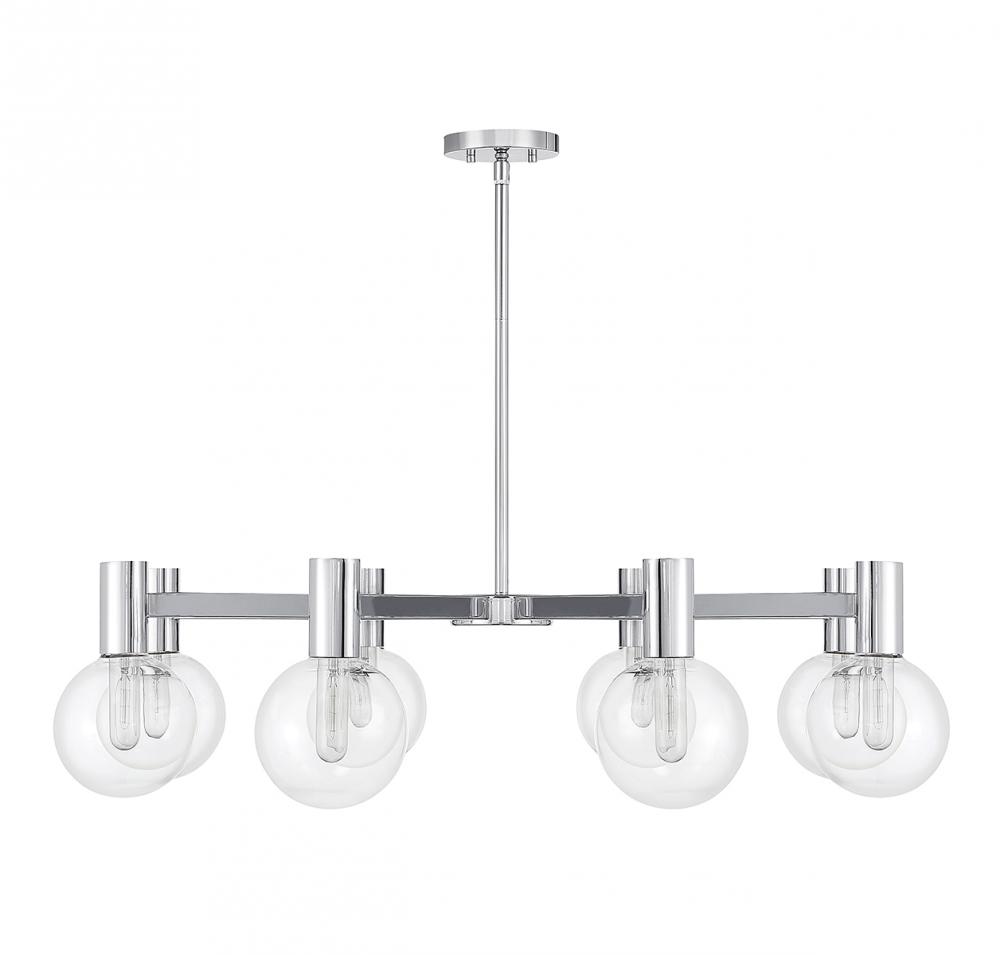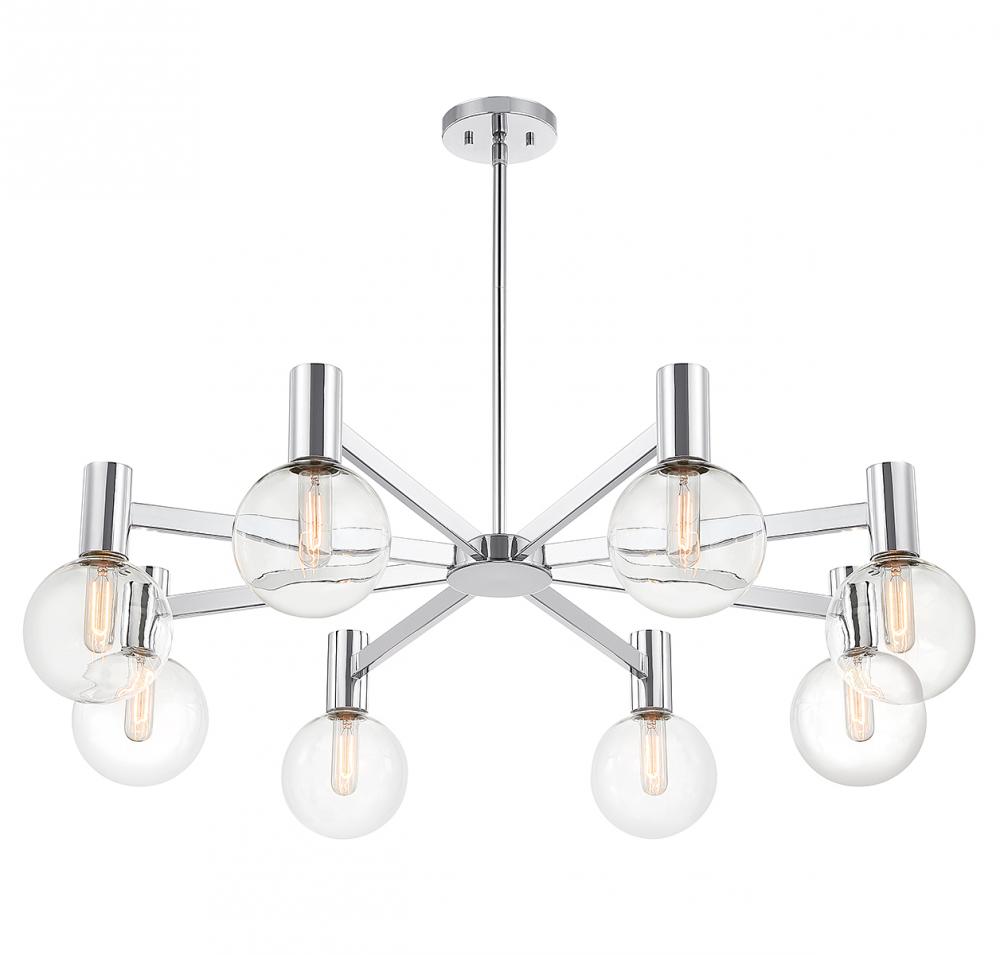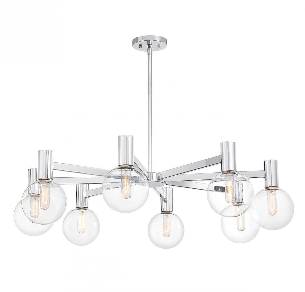 This Savoy House Wright 8-light chandelier showcases large-scale streamlined style that makes it ideal for bigger rooms. Round clear glass shades add an extra dimension and extra protection for the light bulbs within. Chrome finish. Wright is 40" in width and has an adjustable height ranging from 10.5" to 64". Comes with four 12" downrods and one 6" downrod. Uses 8 standard size bulbs of up to 60 watts per bulb (bulbs not included). We recommend using tubular shaped bulbs.