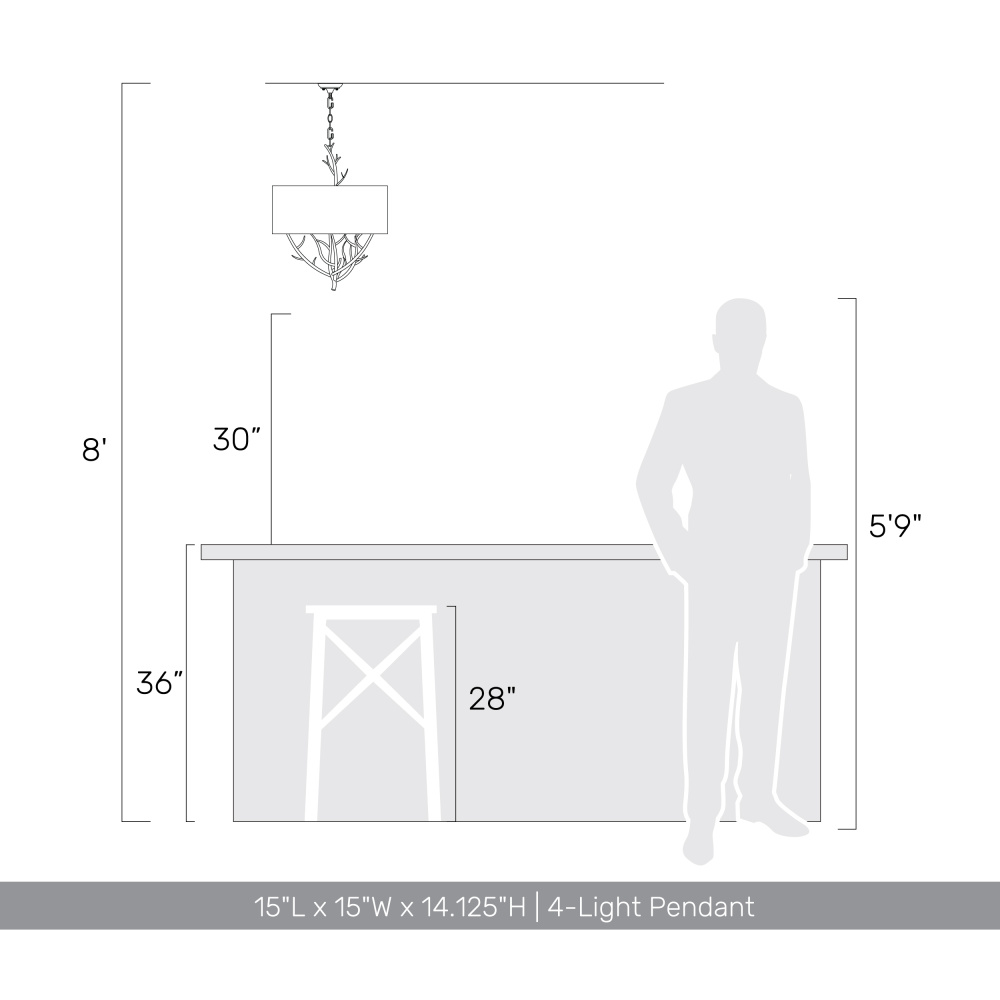 Bring Nature-Inspired elegance into your home with the Wry Lighting Arboreal 4-light Pendant in Antique Black Iron. Featuring a metal shade and a striking Antique Black Iron frame, it creates a welcoming atmosphere. This pendant's eye-catching metal shade, finished in Antique Black Iron, captures the raw, authentic charm of a bygone era. The deeply textured finish features a matte charcoal-black top coat applied over an antiqued gold base, with heavy distressing that authentically simulates weathered iron. The Antique Black Iron finish tells a story of time and endurance. Perfect for industrial and rustic settings, it adds a statement of age and handcrafted character to any space. Versatile for a variety of rooms, this pendant is ideal for kitchens, dining rooms, and bedrooms, and is rated for dry locations, perfect for indoor spaces not subject to moisture. It features a convertible design with adjustable height for sloped or flat ceilings, adjustable from a minimum of 17.875" to a maximum of 91.125". With overall dimensions of 15"W x 14.13"H x 15"D, it requires 4 E12 candelabra base bulbs (not included) with a maximum wattage of 60 per bulb. Elevate your space with the quality and lifestyle appeal of the Wry Lighting Arboreal pendant—where beauty meets craftsmanship.