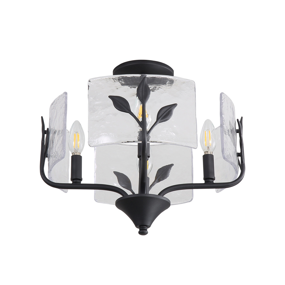 Bring nature-inspired elegance into your home with the Wry Lighting Bloem 4-light Semi-Flush Mount in Natural Black. Featuring a glass shade and a natural black frame, it creates a warm and inviting atmosphere. The glass shade boasts a Hammered Water Glass effect, which reflects and refracts light beautifully, offering a dazzling display. Our Natural Black finish presents a softer, more organic take on traditional black, providing a tactile, grounded presence perfect for various design styles. This semi-flush mount is ideal for entryways, bedrooms, and kitchens with mid-height ceilings and is damp location rated, suitable for covered spaces. Its convertible construction allows for flexible installation. The dimensions are 16"W x 13.63"H x 16"D, and it requires 4 E12 candelabra base bulbs (not included). Enhance your home with this artisanal piece, perfect for pairing beauty and functionality.