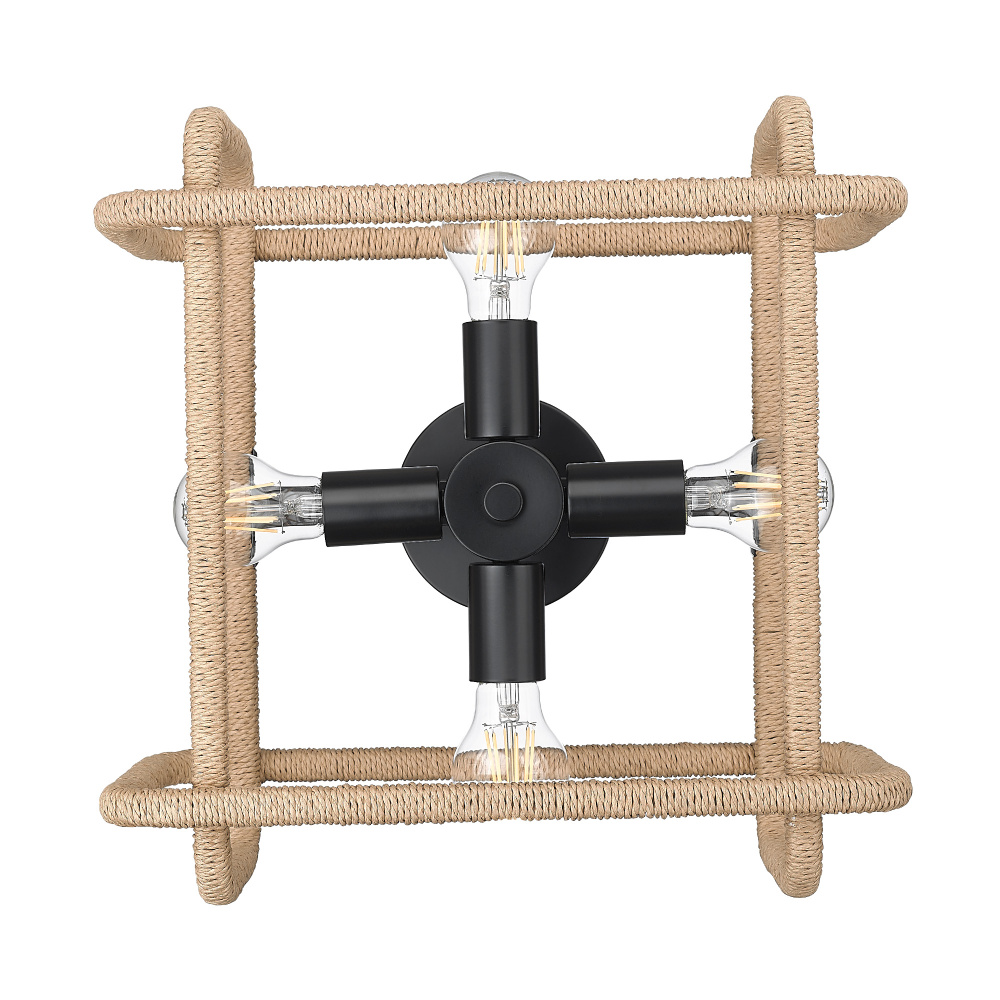 Bring modern flair into your home with the Wry Lighting Camden 4-light Semi-Flush Mount in matte black. This captivating fixture creates a welcoming ambiance perfect for a variety of interior settings. Crafted with handwoven raphia rope, this design introduces an organic texture that evokes a breezy, coastal aesthetic, thoughtful for any room's ambiance. Its matte black finish ensures a timeless look that pairs well with various decor styles, creating depth and sophistication throughout your space. Ideal for entryways, bedrooms, kitchens, and living areas, this semi-flush mount is damp location rated for safety, making it an ideal option for covered areas. With a design suited for sloped ceilings, installation is straightforward and flexible. Featuring overall dimensions of 15.75"W x 11.25"H x 15.75"D, it requires 4 E26 medium base bulbs (not included), with a maximum wattage of 60 per bulb. Elevate your home with this stunning piece by Wry Lighting, combining quality craftsmanship with striking design.