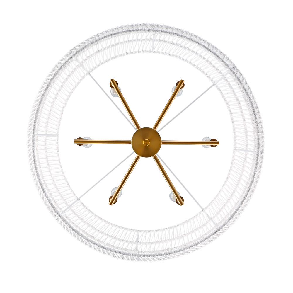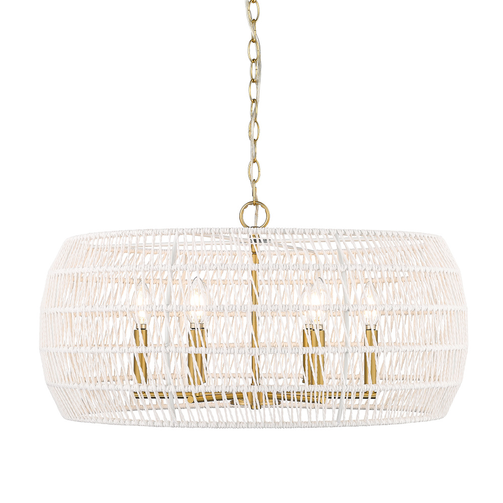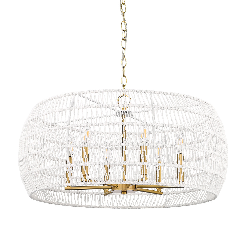 Bring a grand coastal-style statement into your home with the Wry Lighting Ellie 6-light Chandelier. Featuring a rope shade and a luxurious modern brushed gold frame, it orchestrates a warm and inviting atmosphere. The bleached white raphia rope shade offers a unique, textural design that diffuses light beautifully, similar to sun-bleached rope, adding a relaxed vibe to your interior. Our modern brushed gold finish, with its radiant glow, provides a classic yet contemporary appeal. This chandelier is perfect for making a striking impression in dining rooms and foyers or elevating bedrooms and living spaces with elegance. Designed with damp location rating, it's suitable for covered areas with occasional moisture. The convertible feature allows installation as a pendant or semi-flush mount, adjustable for both sloped and flat ceilings for versatility. Overall Dimensions: 27.13"W x 13.5"H x 27.13"D, Requires 6 E12 Candelabra base bulbs (not included), max 60 watts per bulb. Quality craftsmanship and timeless style ensure this chandelier enhances any decor, blending seamlessly into various aesthetics.