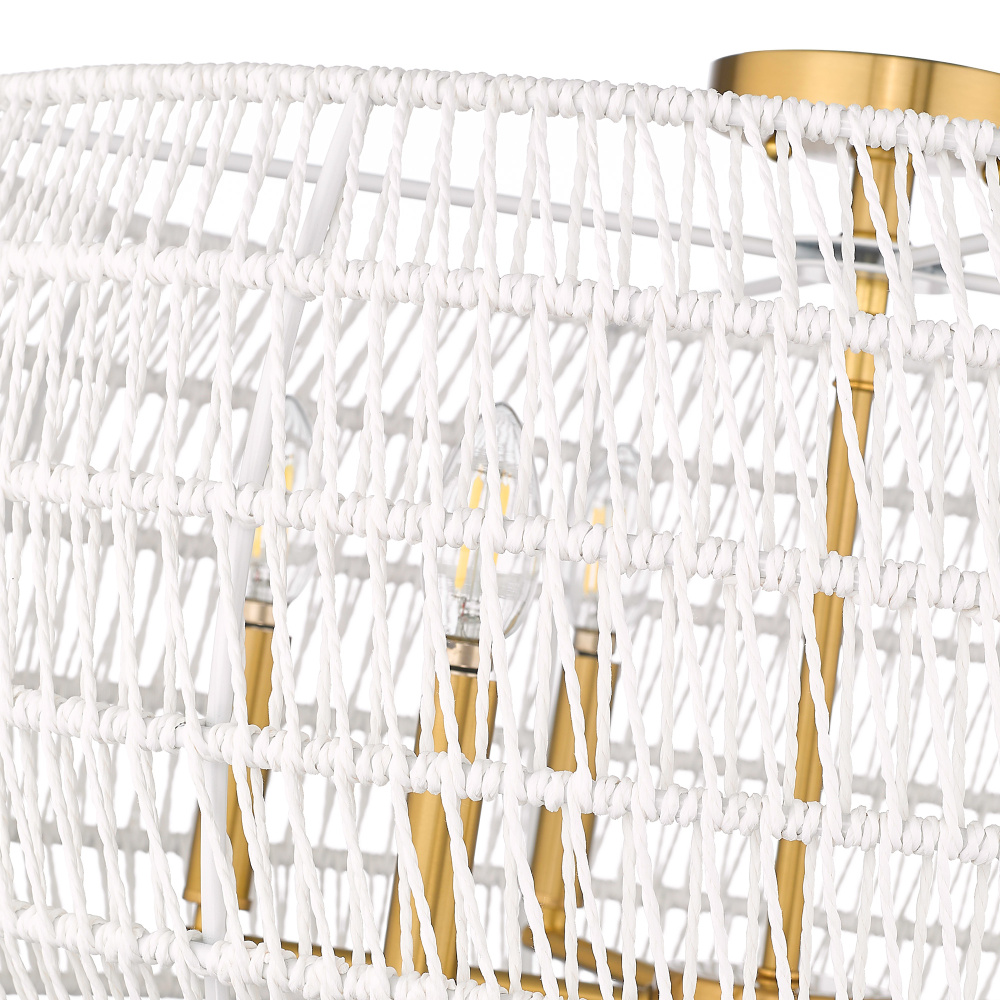 Bring coastal elegance into your home with the Wry Lighting Ellie 6-light Semi-Flush Mount. Featuring a rope shade and a modern brushed gold frame, it creates a welcoming atmosphere. The bleached white raphia rope shade offers a breezy, coastal vibe, enhancing the intricate texture and organic appearance that draws attention and admiration. Our modern brushed gold finish exudes a radiant warmth, enhanced by a satin sheen that beautifully diffuses light, creating an inviting glow throughout your space. This versatile light fixture is suitable for entryways, bedrooms, kitchens, and living areas with mid-height ceilings. Damp-location rated, it’s perfect for covered and semi-enclosed spaces, such as bathrooms and laundry rooms. Convertible with an adjustable height design, you can install it as either a semi-flush mount or a pendant to fit your space perfectly. Overall dimensions are 27.13"W x 13.25"H x 27.13"D, requiring 6 E12 candelabra base bulbs (not included) with a maximum wattage of 60 per bulb. Elevate your home decor with this stunning and practical lighting fixture.