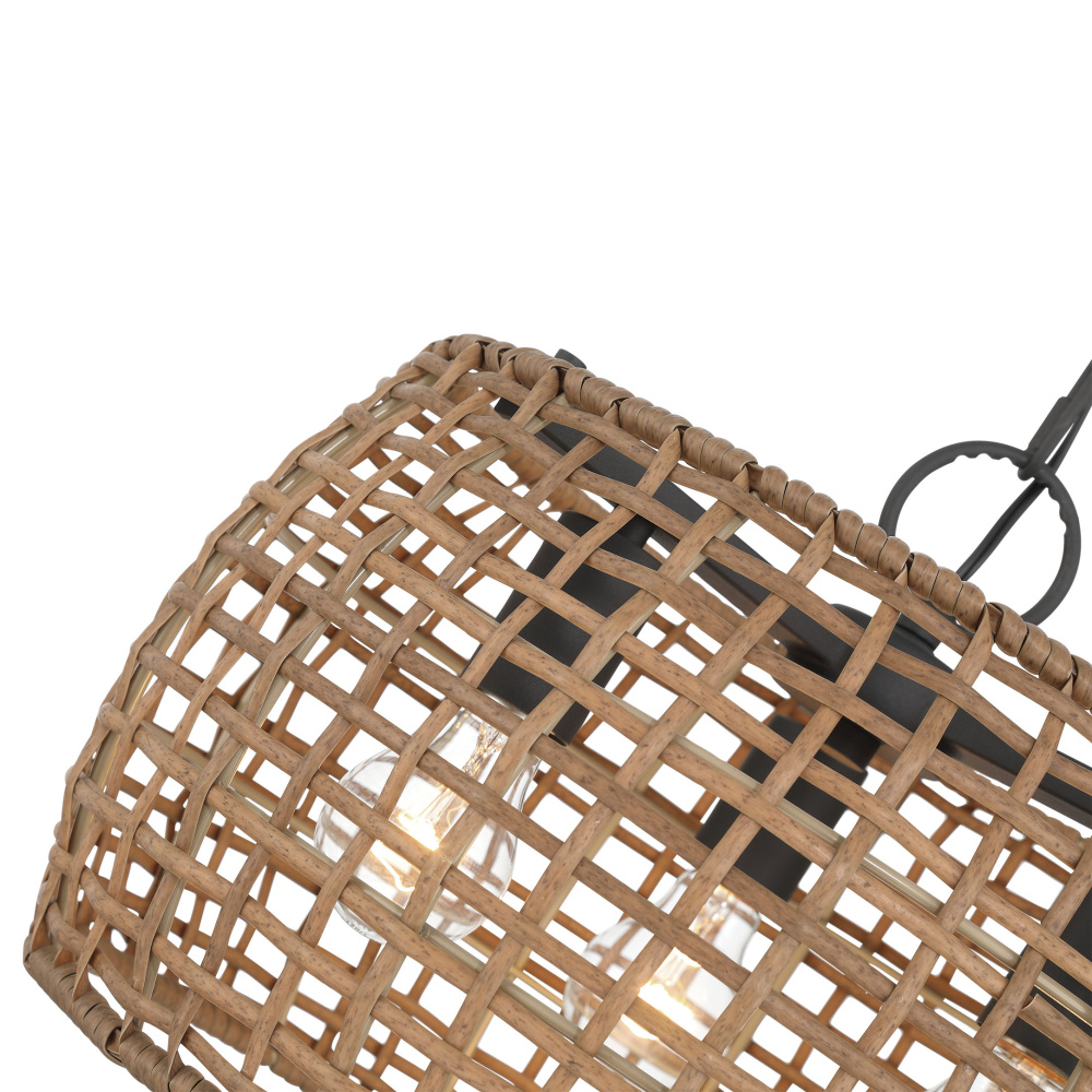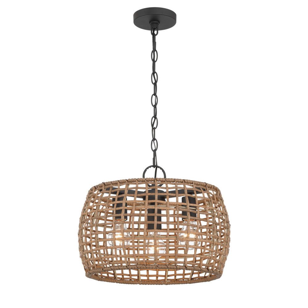 Bring boho elegance into your home with the Wry Lighting Weavelight 3-light Pendant in Natural Black. Featuring a wicker shade and a natural black frame, it creates a welcoming atmosphere. The maple all-weather wicker shade showcases a warm, honey-brown color with natural variations, expertly woven into an open-weave pattern for a rustic, airy look. This charming shade adds a touch of coastal, bohemian appeal to your space while delivering a beautiful interplay of light and shadow for an organic texture. The natural black finish offers a softer take on classic black, featuring a chalky, non-reflective matte surface reminiscent of raw iron, perfectly complementing various styles from modern farmhouse to industrial. Ideal for kitchens, dining rooms, or bedrooms, the dry location rating makes it perfect for indoor spaces not subject to moisture. The sloped-ceiling compatibility allows for easy installation on angled ceilings, with an adjustable height ranging from 15.5" to 89". Overall dimensions of 16"W x 12.13"H x 16"D, this fixture requires three E26 medium base bulbs (not included) with a maximum wattage of 100 per bulb. Elevate your space with this stylish piece that promises quality and timeless appeal.