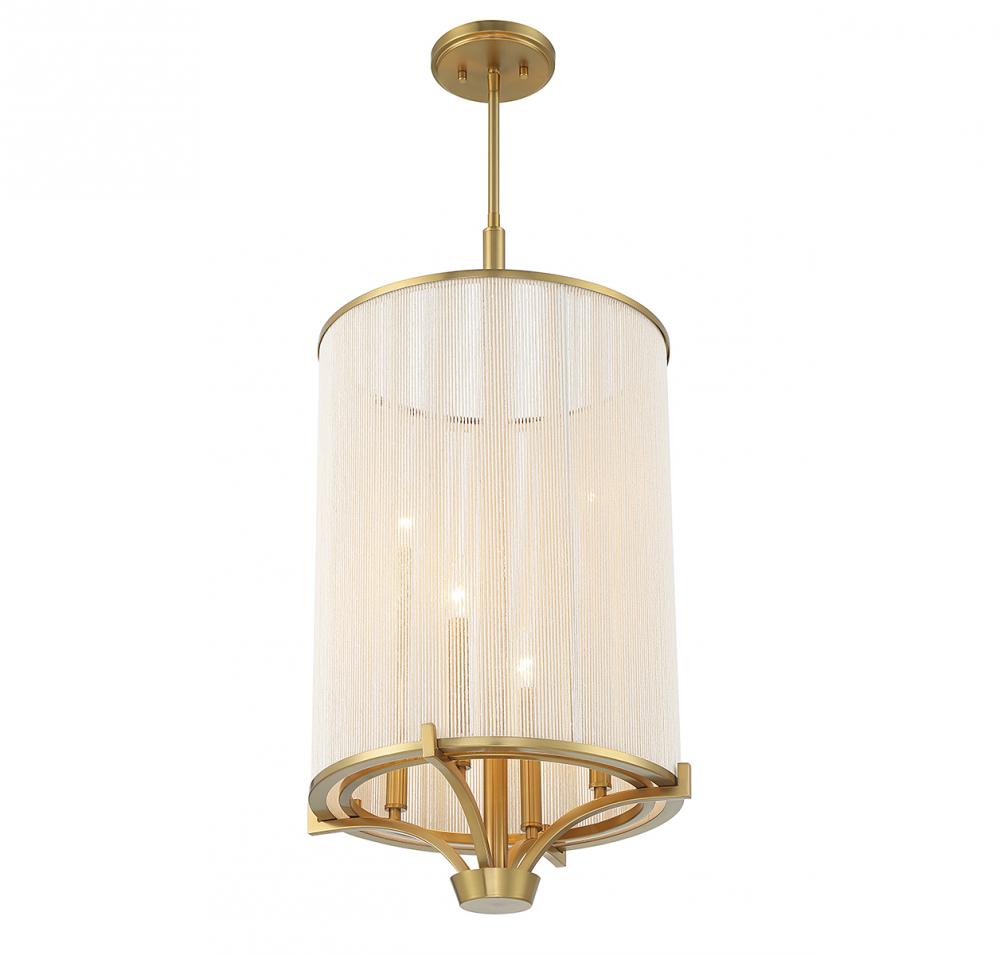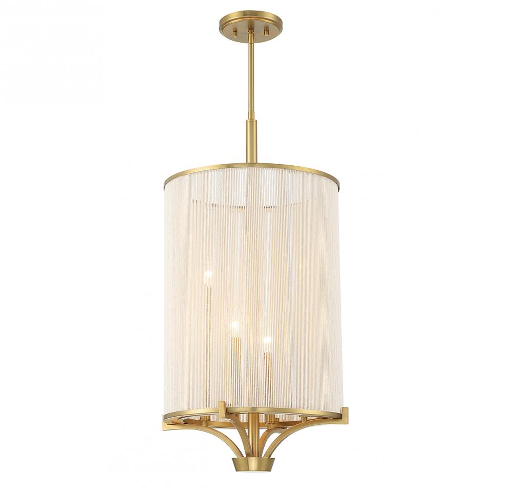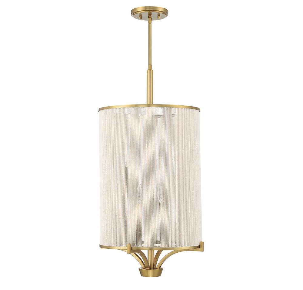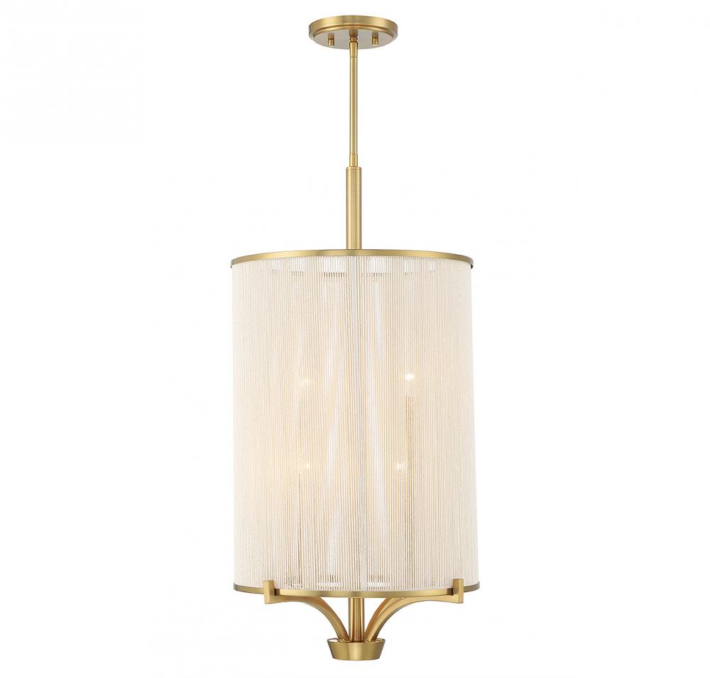 A boldly classic structure is given a touch of organic softness in this Savoy House Wynwood 4-light chandelier. Its shade showcases soft white string that, when combined with the warm brass finish, offers up a beautifully elegant effect. Wynwood is 16" in width and has an adjustable height ranging from 32.5" to 86". Comes with four 12" downrods and one 6" downrod. Uses 4 candelabra size bulbs of up to 60 watts per bulb (bulbs not included).