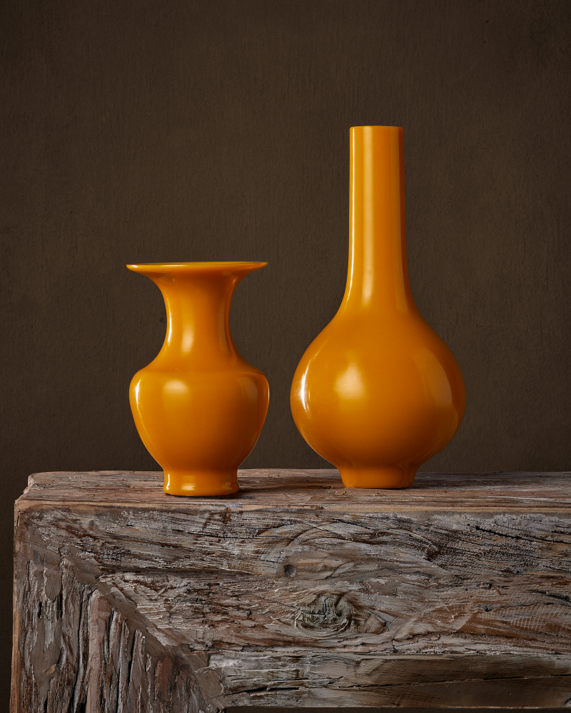 The Imperial Yellow Peking Long Neck Vase is made of glass that is of an exceptional density and weight. The centuries-old methods that result in such remarkably thick and luminous glass is achieved by only two small factories whose artisans have the skills and know-how to successfully achieve the excellent quality evident in this yellow glass vase. These are modeled after artifacts that were once produced for the Chinese Imperial palace.