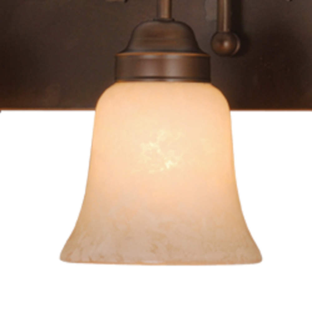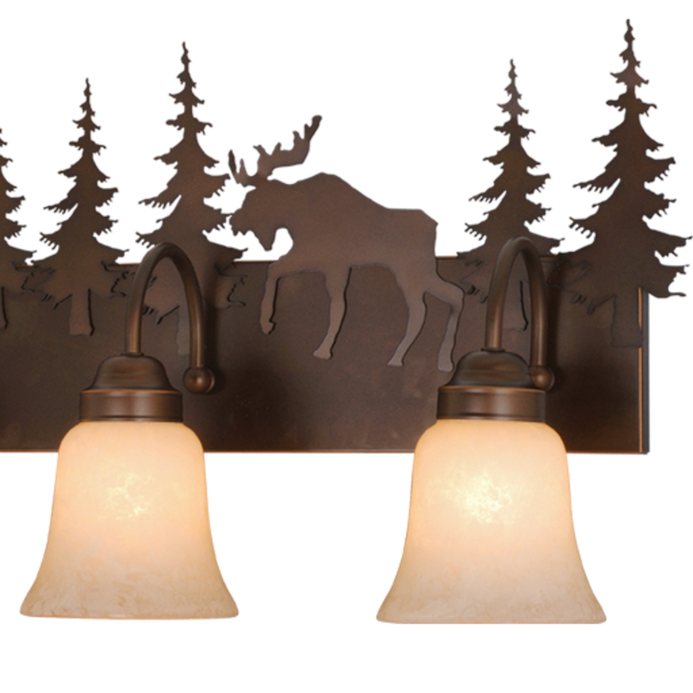 Evoking the spirit of the wilderness, this rustic themed light is clad in a burnished bronze finish and features silhouetted moose imagery atop glowing amber flake glass. It is a great choice for a vacation lodge, cabin or suburban home and will complement a variety of home styles: anywhere you want to bring an element of nature. This bathroom light is perfect over medium vanities or as a pair over double sinks. The full back plate creates the perfect solution to any space where a larger back plate is needed.