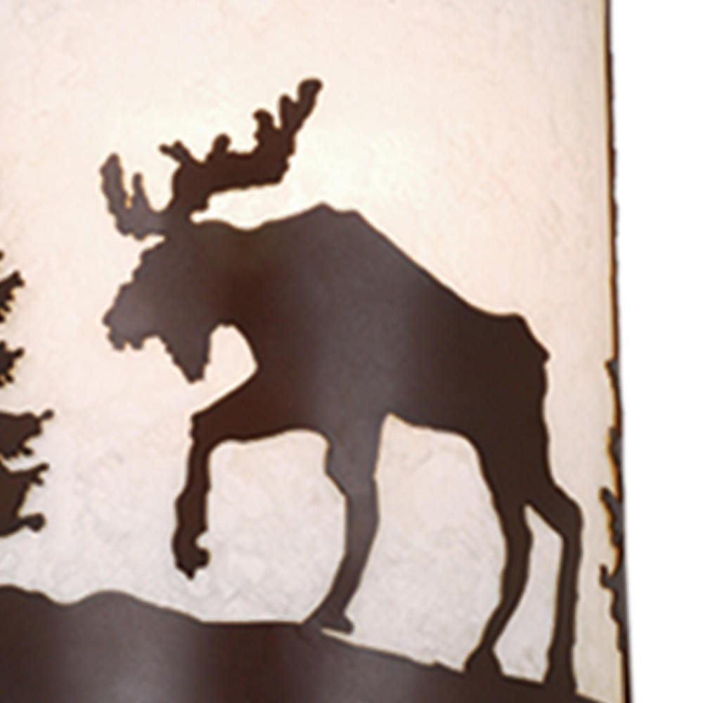 Evoking the spirit of the wilderness, this rustic themed light is clad in a burnished bronze finish and features silhouetted tree and moose imagery atop glowing white tiffany style glass. It is a great choice for a vacation lodge, cabin or suburban home and will complement a variety of home styles: anywhere you want to bring an element of nature. This versatile light is outdoor damp rated and can be used indoors as well as outdoors. Mount these lights on your porch, hallway, or entryway and experience this stylish look for yourself.