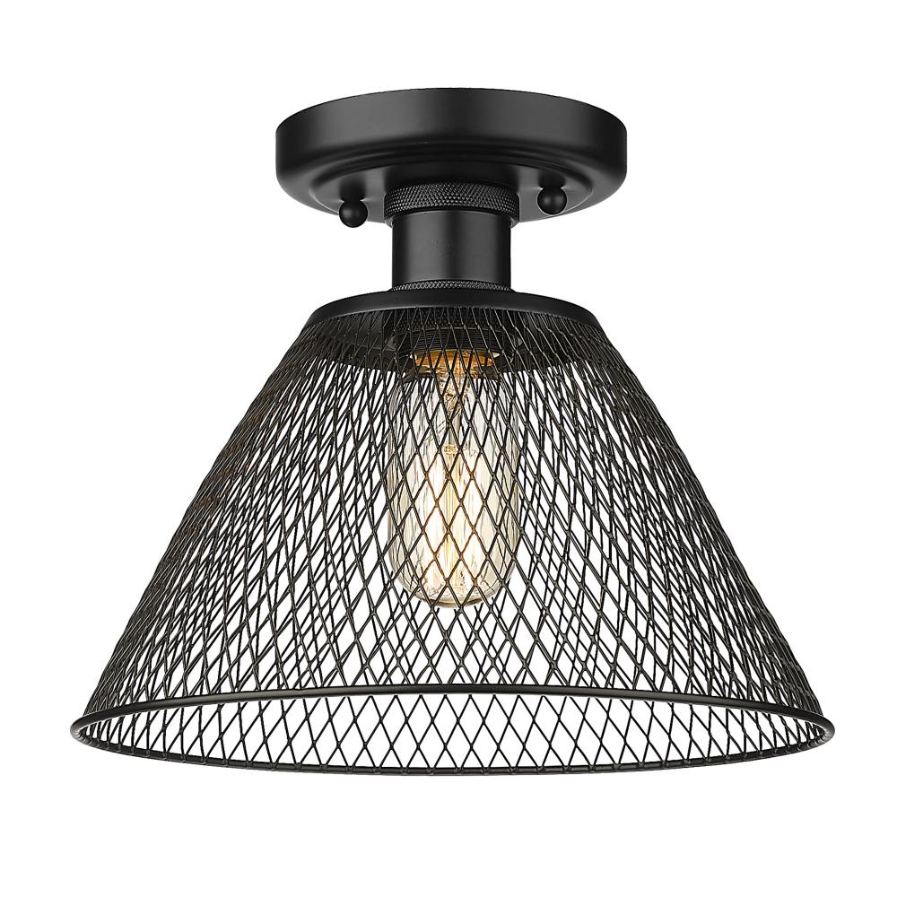 Bring industrial elegance into your home with the Yep by Golden Lighting Carver 1-light Semi-Flush Mount. Featuring a metal shade and a matte black frame, it creates a welcoming atmosphere. The metal shade, crafted with a cone-shaped wire mesh, offers a unique textural aesthetic that celebrates the beauty of raw materials while providing an inviting warm glow. Complemented by a matte black finish that absorbs light and enhances the fixture's graphic quality, this semi-flush mount is both timeless and versatile. Ideal for a blend of style and practicality in entryways, bedrooms, kitchens, and living areas with mid-height ceilings. This fixture is damp location rated, suitable for covered and semi-enclosed spaces with occasional moisture. Overall Dimensions: 10"W x 8.25"H x 10"D. Requires 1 E26 Medium base bulb (not included), max 100 wattage. Embrace the raw beauty of factory-chic design combined with quality, ensuring a captivating look for your home.