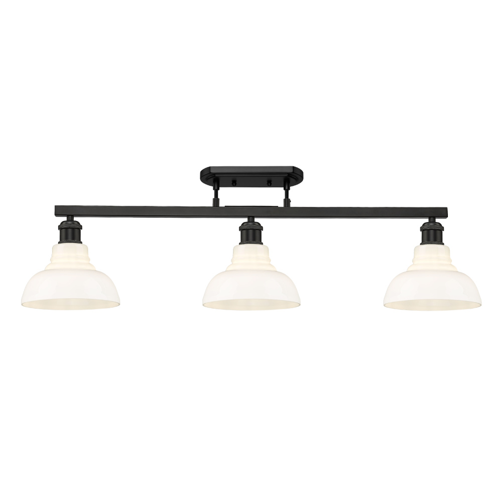 Bring transitional elegance into your home with the Yep by Golden Lighting Carver 3-light Semi-Flush Mount in Matte Black and Vintage Milk Glass. Featuring a vintage milk glass shade and a matte black frame, it creates a welcoming atmosphere. The vintage milk glass shade is polished to a high-gloss sheen, providing a soft, luminous glow that adds nostalgic charm to any room. Its dense, opaque milky white color creates a glare-free light, perfect for achieving a warm and inviting ambiance. The matte black finish is both timeless and versatile, offering sophistication that pairs well with various decor styles. This fixture is damp location rated, making it suitable for covered and semi-enclosed spaces such as entryways, kitchens, and bedrooms. The adjustable hanging height allows for customizable installation tailored to your specific ceiling height. Overall dimensions are 35.5"W x 11.13"H x 7.63"D, and it requires 3 E26 Medium base bulbs (not included) with a maximum wattage of 60 per bulb. Enhance your home ambiance with this stylish fixture that marries form and function, delivering abundant light while maintaining valuable headspace.