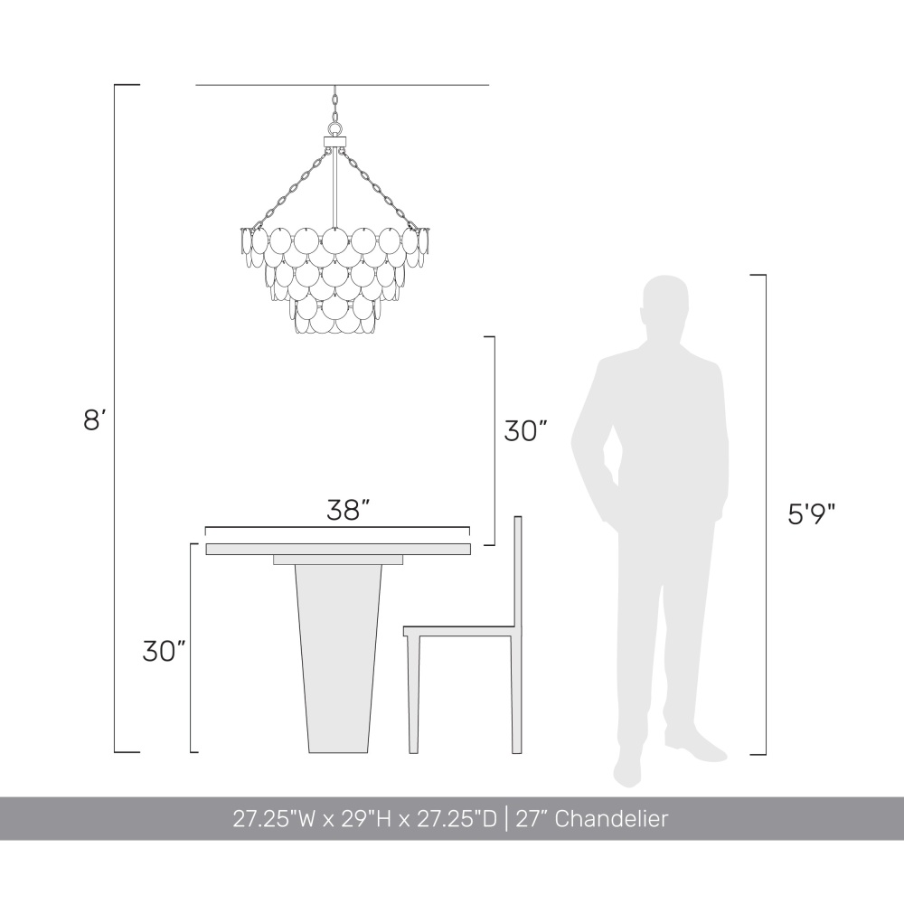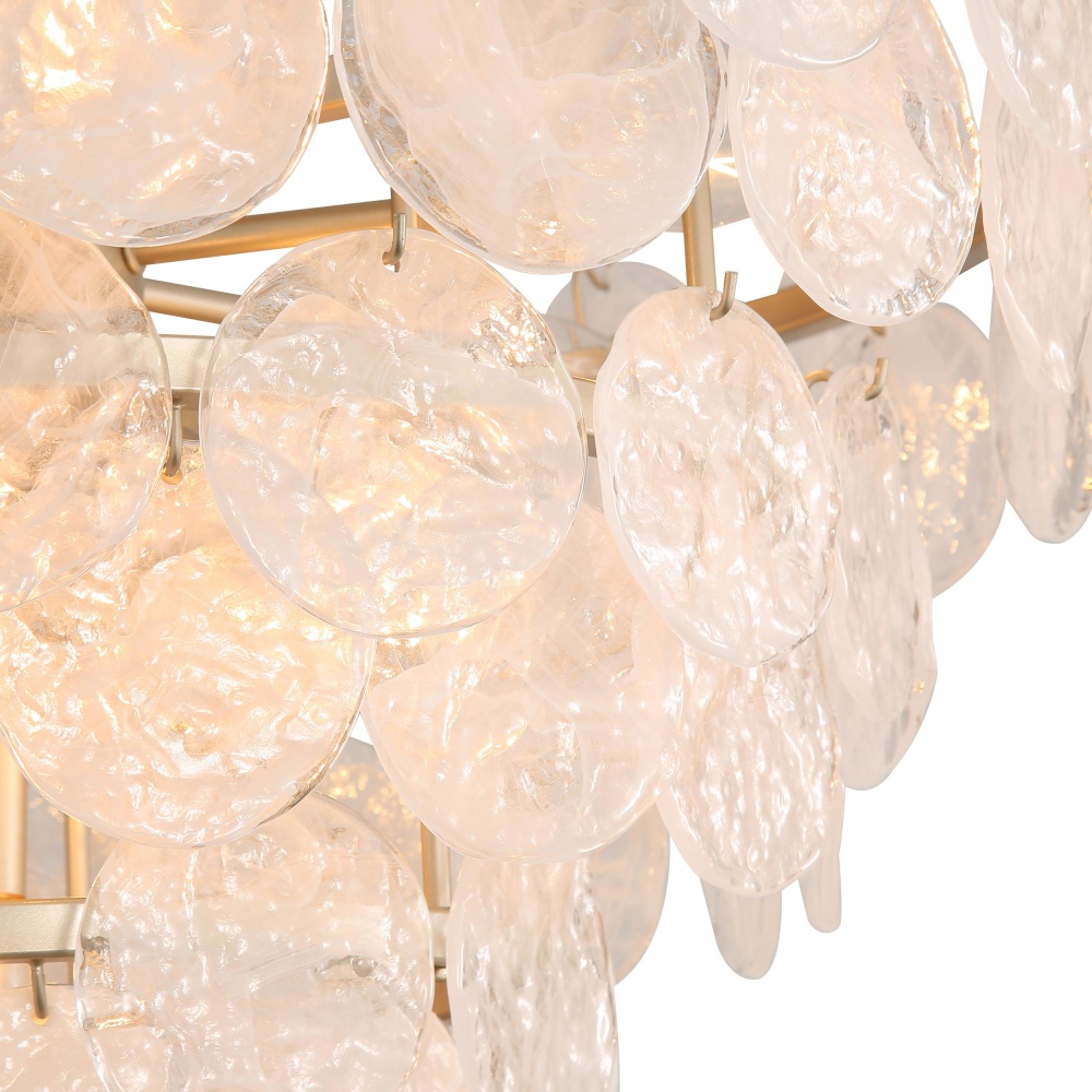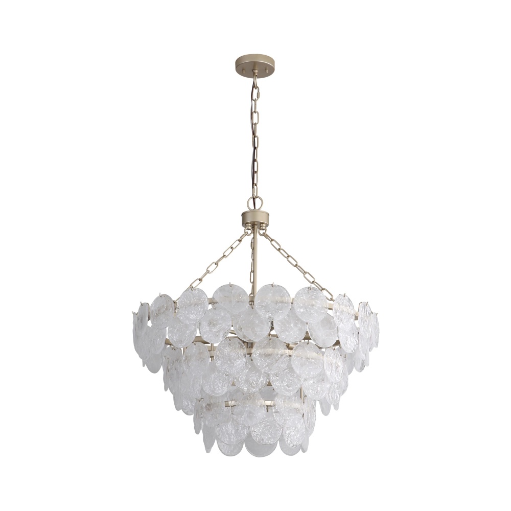 Bring coastal elegance into your home with the Yep by Golden Lighting Cascada 11-light Pendant in Aegean Silver and Cirrus Cloud Glass. Featuring a glass shade, this stunning piece creates a welcoming atmosphere. Each shade is crafted from exquisite Cirrus Cloud Glass that showcases wispy white swirls within a clear base, featuring a heavy, hammered texture that catches and reflects light beautifully. The Aegean Silver finish enhances this fixture's modern appeal with a soft satin lustre and dynamic depth, making it a versatile choice for various settings. Perfect for large dining rooms, kitchens, or grand entryways, this pendant is dry location rated for indoor use. Easy to install with sloped-ceiling compatibility, the height is adjustable from 32.5" to 106.5". Overall Dimensions: 27.25"W x 29"H x 27.25"D. Requires 11 E12 Candelabra base bulbs (not included), max 60 watts per bulb. Transform your home with this exquisite light fixture that emphasizes quality craftsmanship and elegant design.