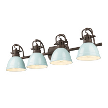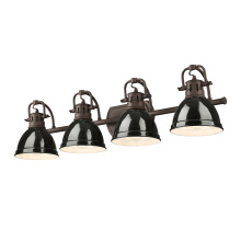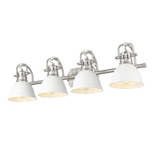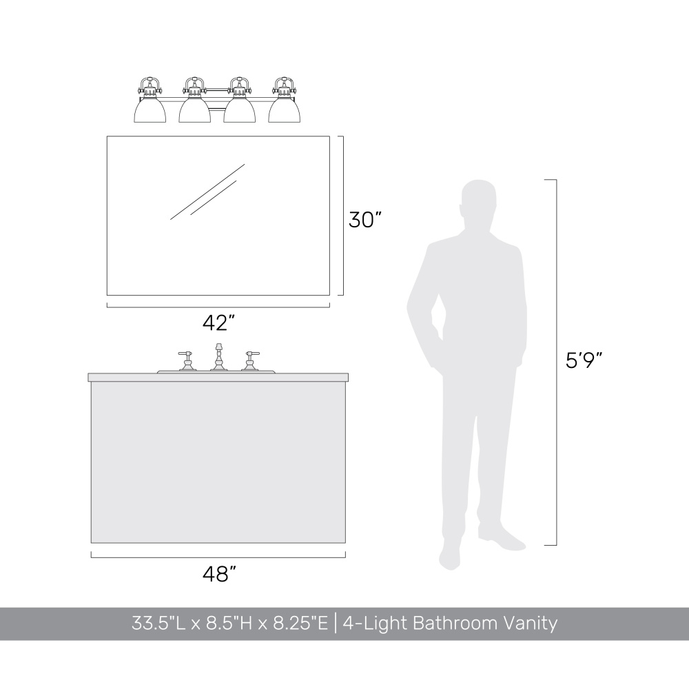 Bring bold character into your home with the Yep by Golden Lighting Duncan 4-light Vanity. Featuring a metal shade and a polished Chrome frame, it generates a welcoming and vibrant atmosphere. The bright Red metal shade makes a bold statement, finished with a smooth surface and glossy sheen that captures attention while enhancing the light beautifully. The elegant Chrome finish complements this striking color, providing a crisp and clean look that suits various decor styles from modern to nostalgic. This fixture is damp location rated, ideal for use in bathrooms and covered areas. The adjustable directional heads allow you to focus the light where you need it most. Overall dimensions are 33.5"W x 8.5"H x 8.25"D, and it requires 4 E26 Medium base bulbs (not included), maximum 100 watts per bulb. Elevate your bathroom with this stylish and eye-catching lighting solution that offers both function and flair.