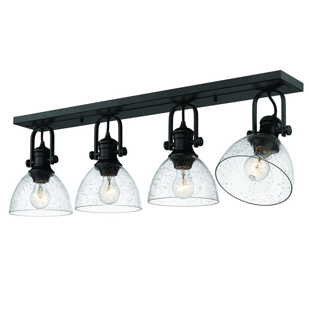 Elevate your space with the contemporary style of the Yep by Golden Lighting Hines 4-light Semi-Flush Mount. Featuring a Seeded Glass shade and a sleek Matte Black finish, it creates an inviting and elegant atmosphere. The Seeded Glass shade enhances the fixture's overall appeal with its textured, clear glass that catches the light beautifully. Tiny infused air bubbles add a unique touch, creating a warm and inviting glow reminiscent of artisanal craftsmanship. This stylish Matte Black finish offers a modern touch, absorbing light to create a sophisticated look that complements both minimalistic and bold décor styles. Perfect for entryways, bedrooms, kitchens, and living areas with mid-height ceilings, this fixture is damp location rated, making it suitable for covered and semi-enclosed areas. Adjustable directional heads allow you to customize lighting to highlight specific areas or objects. Overall Dimensions: 34.5"W x 10.38"H x 6.88"D. Requires 4 E26 Medium base bulbs (not included), with a maximum wattage of 60 watts each. Transform your home with this beautiful and functional fixture that combines style with quality, providing a radiant and sophisticated glow for your living spaces.