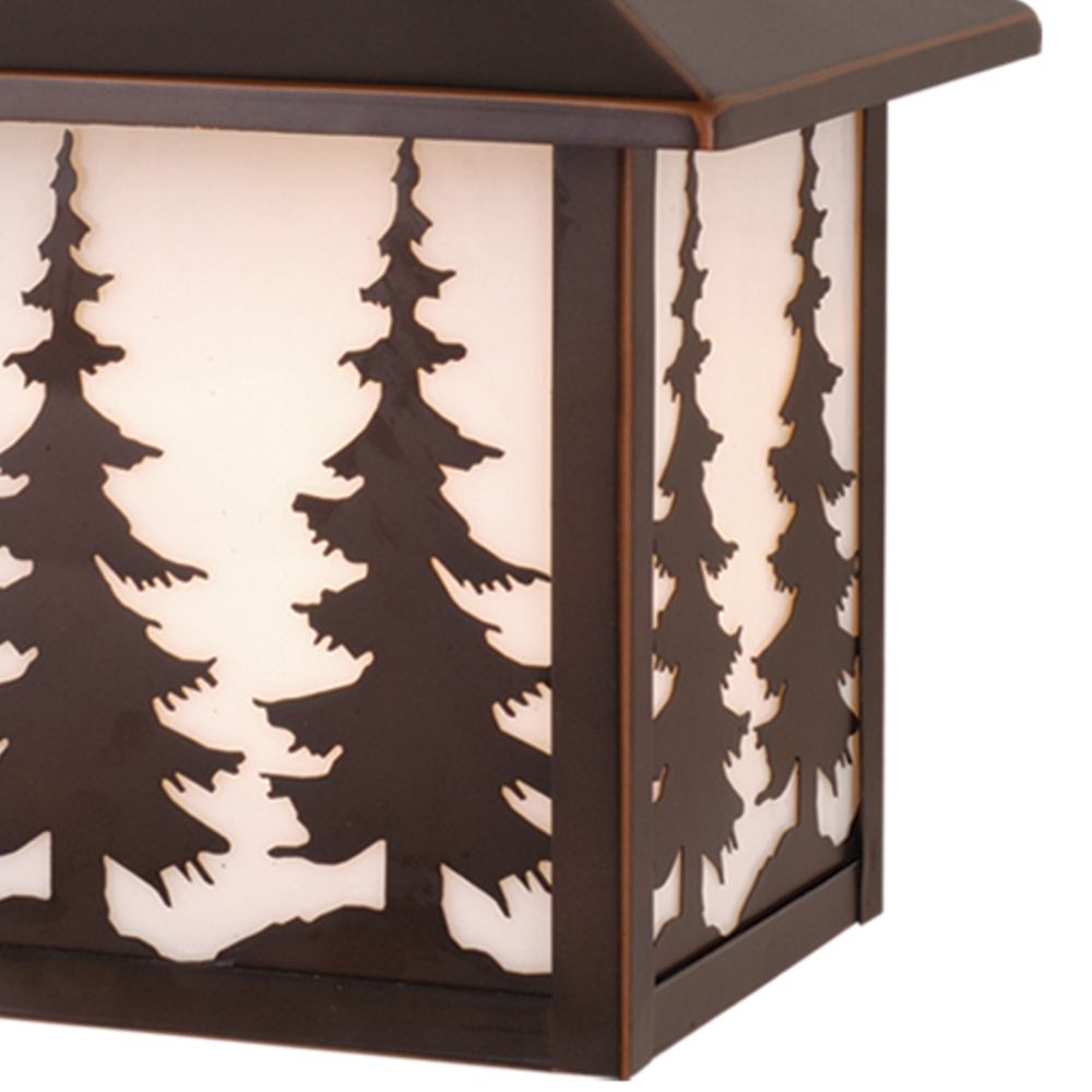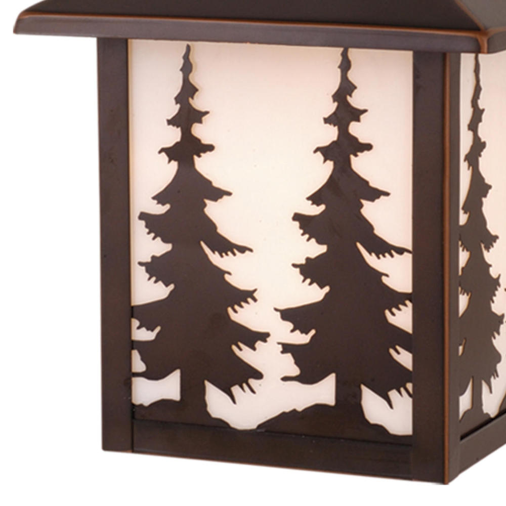 Evoking the spirit of the wilderness, this rustic themed light is clad in a burnished bronze finish and features silhouetted tree imagery atop glowing white tiffany style glass. It is a great choice for a vacation lodge, cabin or suburban home and will complement a variety of home styles: anywhere you want to bring an element of nature. This outdoor wall light is ideal for your porch, entryway, garage, or any other area of your home.
