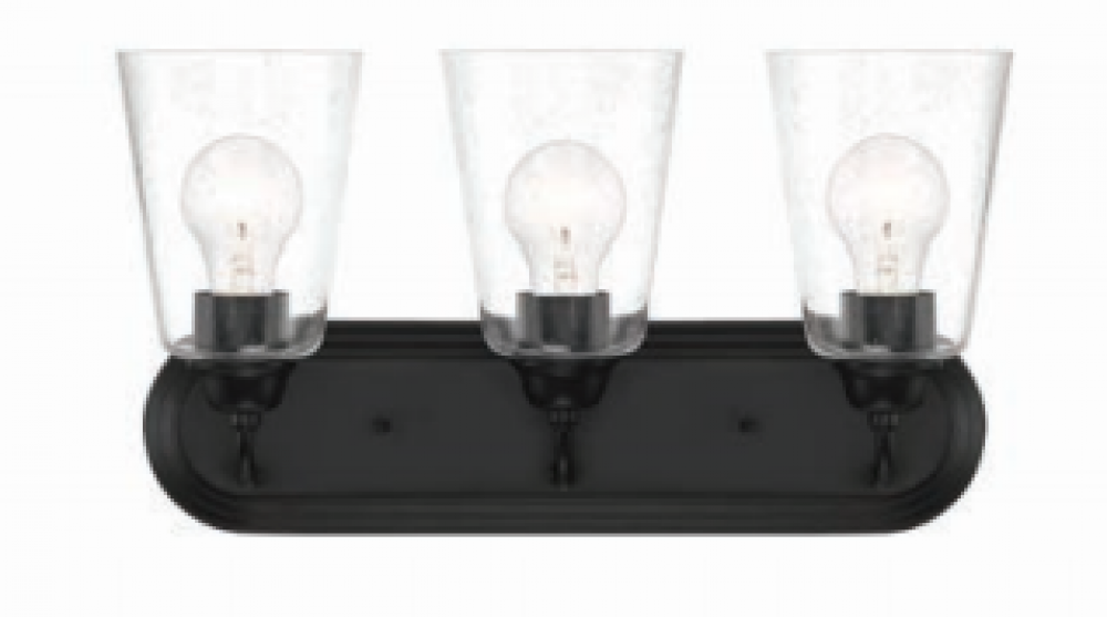 Matte Black 3 Light Vanity with clear seedy glass is part of the Zane collection