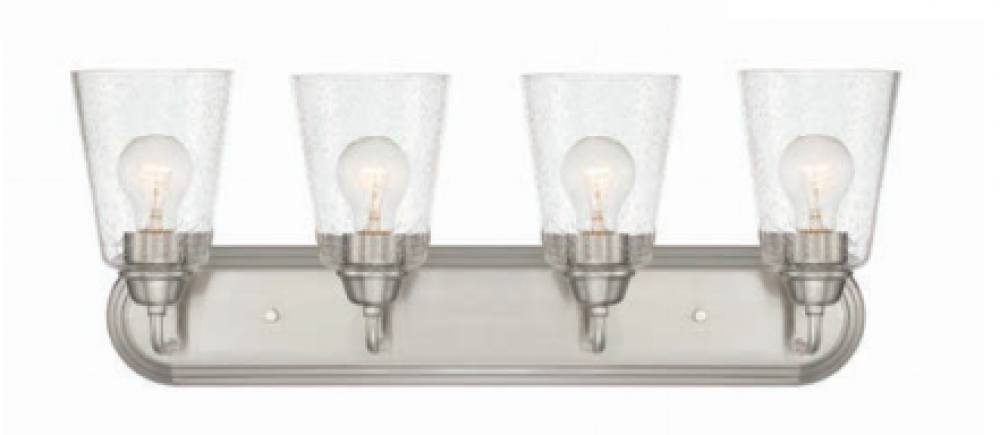 Brushed Nickel 4 Light Vanity with clear seedy glass is part of the Zane collection