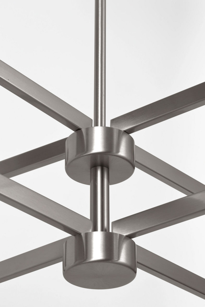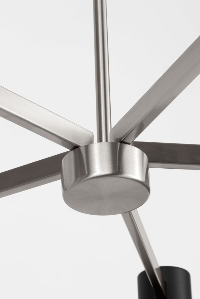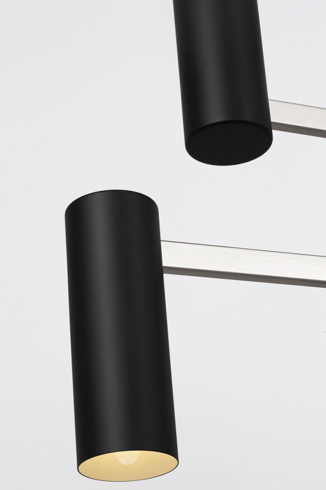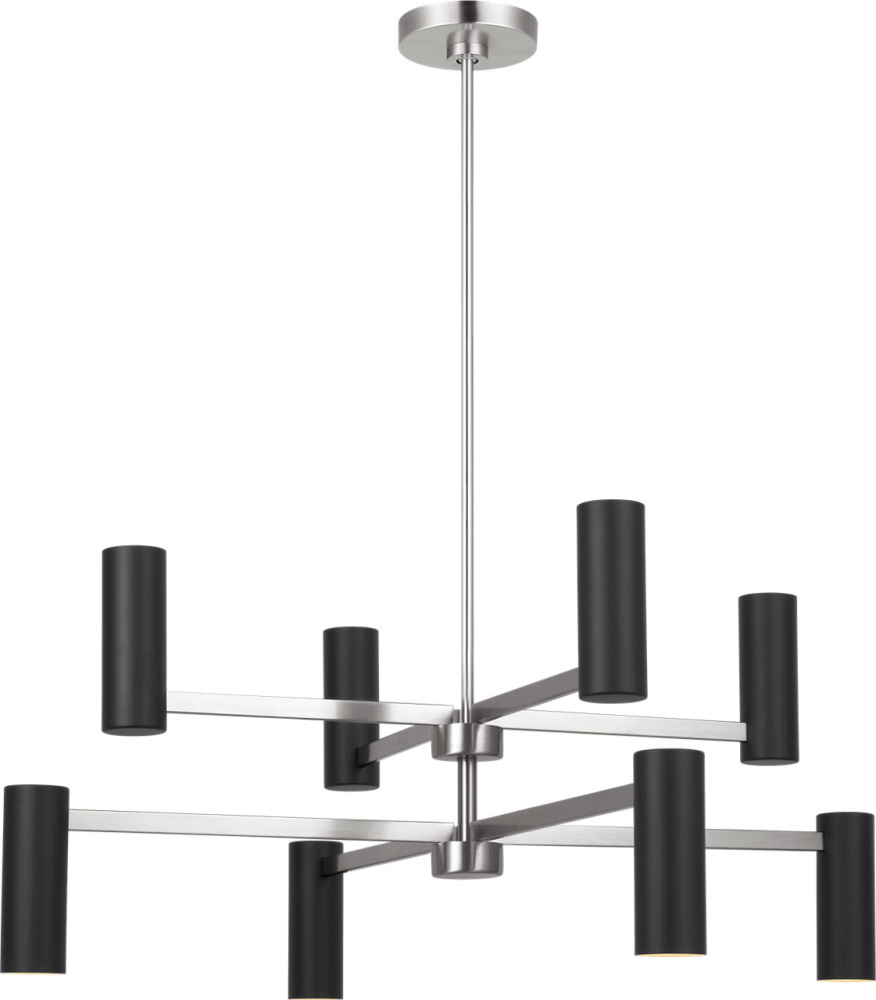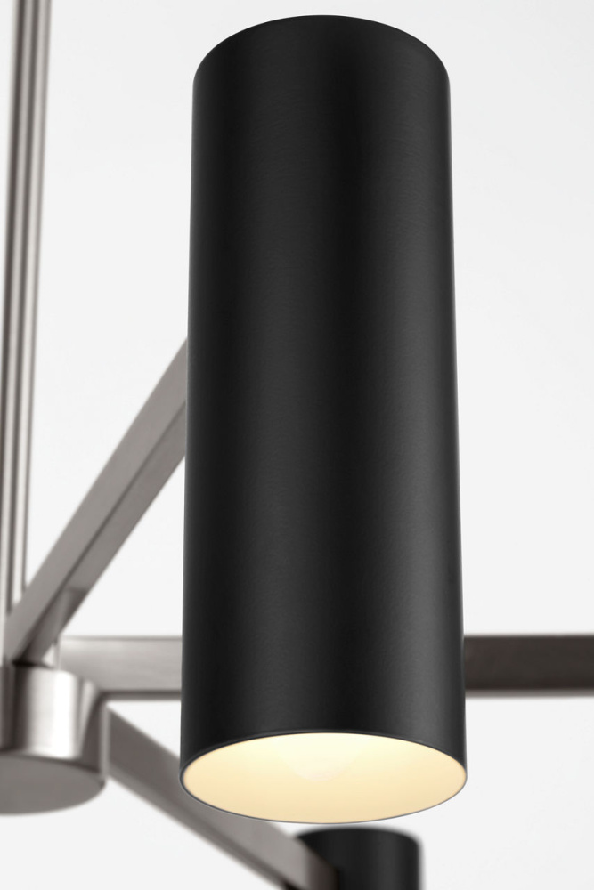 The Zentro 8-Light Chandelier features eight cylindrical metal shades arranged into a two-tier arrangement around a central hub. with its balanced proportions and clean lines, it delivers focused downlight while maintaining an airy, open silhouette. Scaled for dining rooms, living spaces, and bedrooms, this chandelier adapts across interiors with its refined simplicity.
