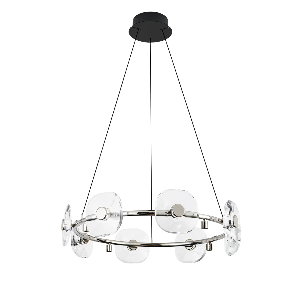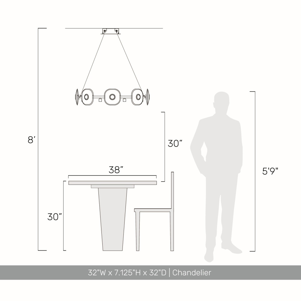 Bring modern elegance into your home with the Ziva by Golden Lighting Celestia 8-light Integrated LED Chandelier in Chrome. Featuring a sophisticated design with no shade, this chandelier showcases flawless K9 crystal discs that amplify light beautifully. Each K9 crystal disc is crafted with exceptional clarity and refractive properties, creating a dazzling light effect that envelops your space in warmth and dimension. The brilliant Chrome finish adds a sleek, timeless look that easily integrates into various decor styles—from ultra-modern to classic traditional. Ideal for dry locations, this chandelier is perfect for indoor spaces like bedrooms, living rooms, and hallways. It is sloped-ceiling compatible, and adjustable in height from 36.75" to 137.75", allowing you to customize its position for optimal visual impact. With overall dimensions of 32"W x 7.13"H x 32"D, this fixture features integrated LED technology, providing 4240 lumens of warm light at 3000K, blending energy efficiency with elegant design. Elevate the ambiance of your home with this captivating centerpiece, where quality and style come together beautifully. Showroom Only.