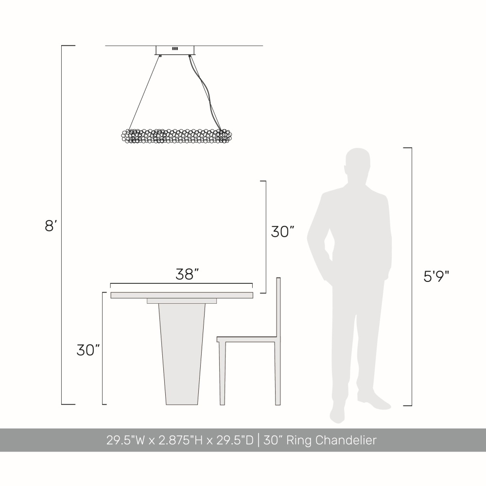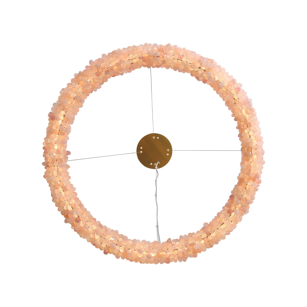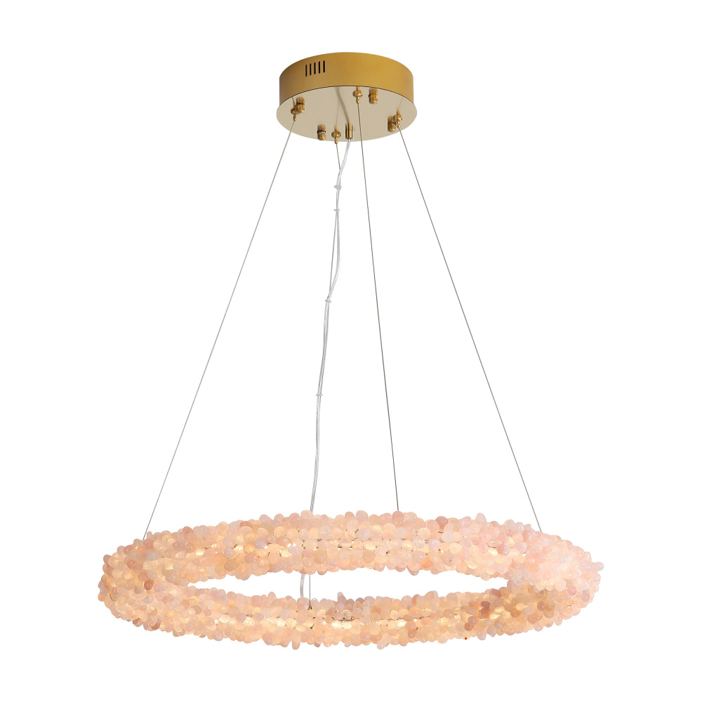 Bring nature-inspired elegance into your home with the Ziva by Golden Lighting Corallo Integrated LED 30in Chandelier. Crafted entirely from exquisite natural gemstones, this chandelier radiates warmth without the use of any shades. Hand-selected rose quartz crystals create a breathtaking look, transforming your space into a serene oasis. This piece showcases hundreds of individual, tumbled rose quartz stones, allowing each to glisten beautifully when illuminated. The smooth, polished luster of the gemstones creates a luxurious atmosphere. The chandelier is ideal for dining rooms, foyers, and living spaces. Designed for dry locations, it is easy to install with its sloped-ceiling compatibility and adjustable height feature, allowing customization from a minimum of 13.75" to a maximum of 145.625". Overall Dimensions: 29.5"W x 2.88"H x 29.5"D. Integrated LED technology offers brilliant illumination with 6444.42 rated lumens and a warm 3000K glow. Make a statement in your home with this one-of-a-kind lighting fixture, celebrating the beauty of the natural world.