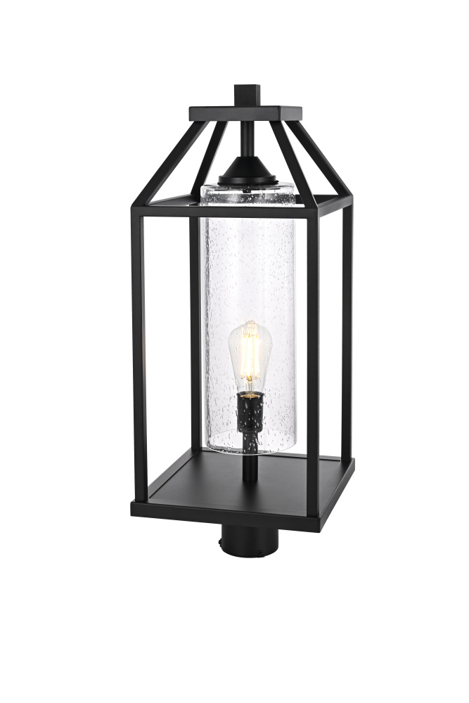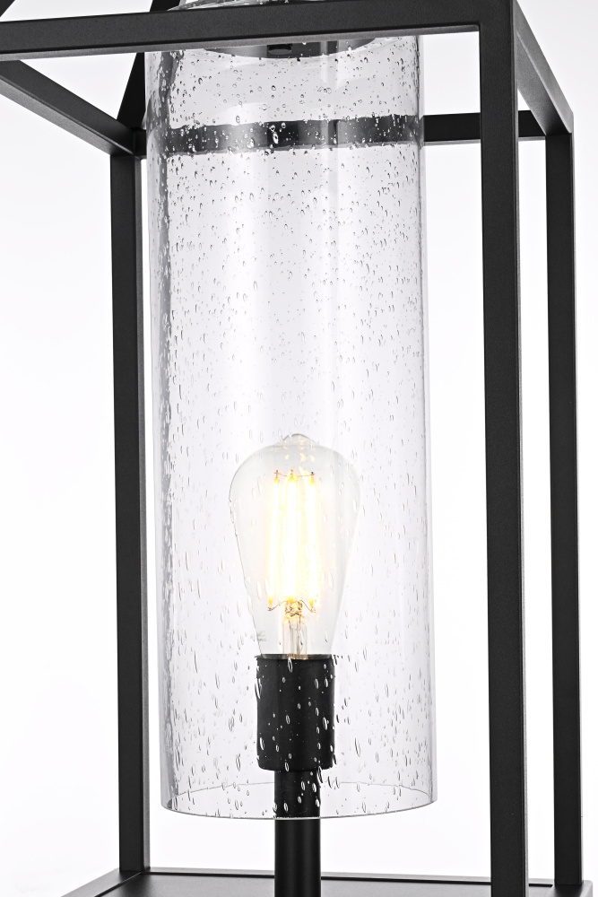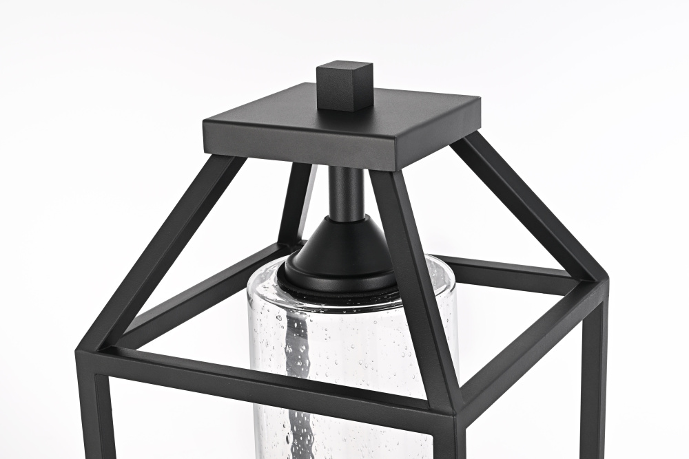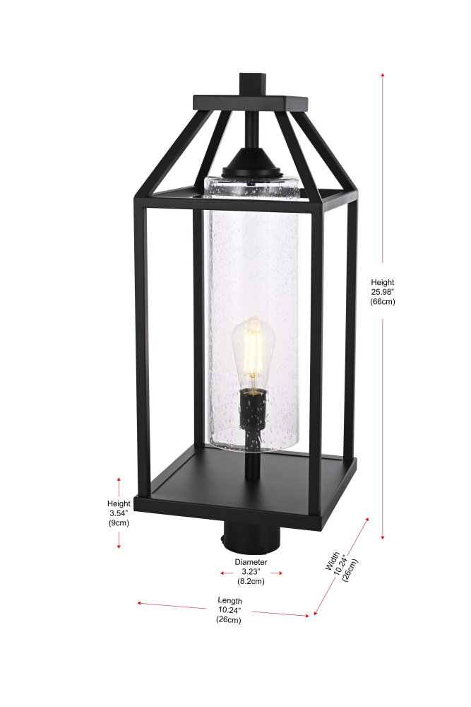 This post light brings a bold, geometric presence to outdoor spaces with its open rectangular frame and peaked roof design. The clear seedy glass cylinder inside enhances the light output while adding subtle texture, creating a dynamic visual effect. Crafted from iron and aluminum, the durable black-finished frame ensures strength and weather resistance, making it ETL Wet Rated for driveways, walkways, and garden landscapes. The 3.23-inch wide base fits most standard post light poles (pole not included), making installation straightforward. This fixture is dimmable and requires one medium-base E26 bulb (not included), offering flexibility in brightness and bulb selection. With a structured frame and thoughtful material choices, this post light blends modern form with practical outdoor lighting solutions. Built with marine-grade, corrosion-resistant aluminum, this sconce withstands coastal conditions for long-lasting durability.