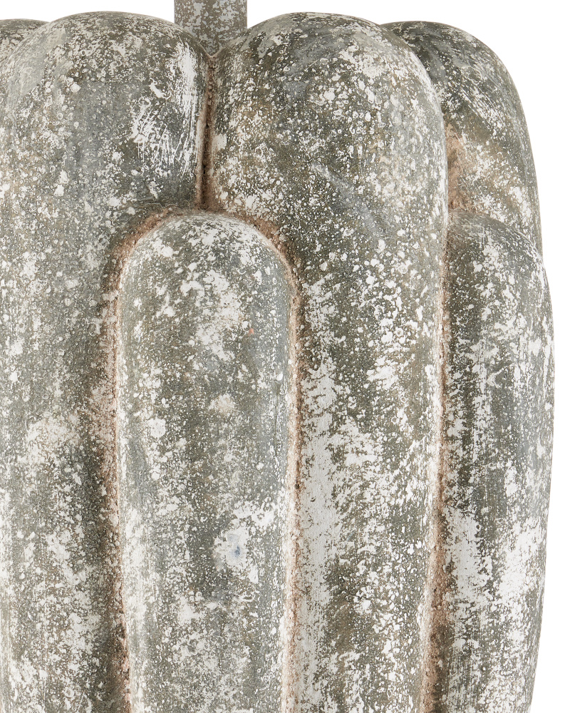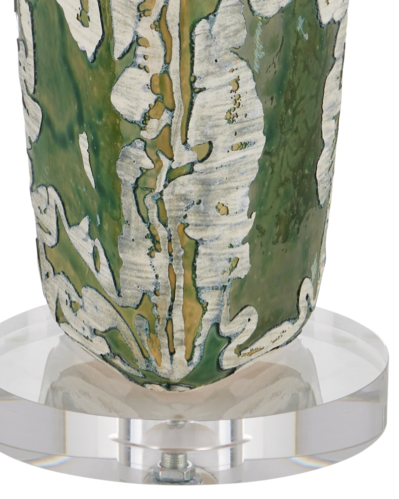 The Zowan Table Lamp is made of ceramic in a matte green smoke glazing flowing along its surface that looks like a genealogical map. The cream that overlays the green has been hand-applied to bring the lamp an artful feel, and the optic crystal base from which the fixture rises leaves the painterly column to be the focal point of the design. One of the interesting things about this green lamp is that the pattern will change slightly when seen from different angles.